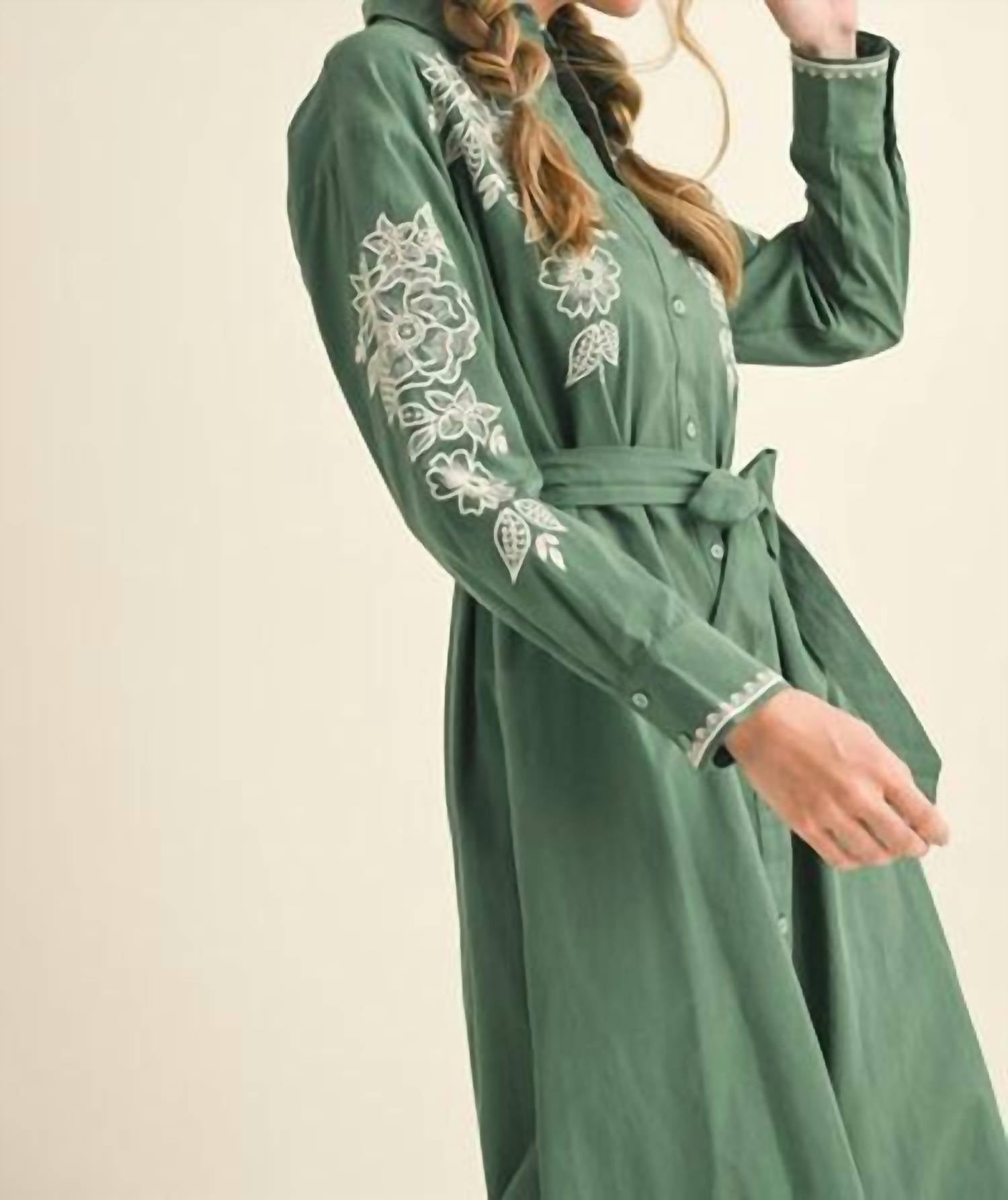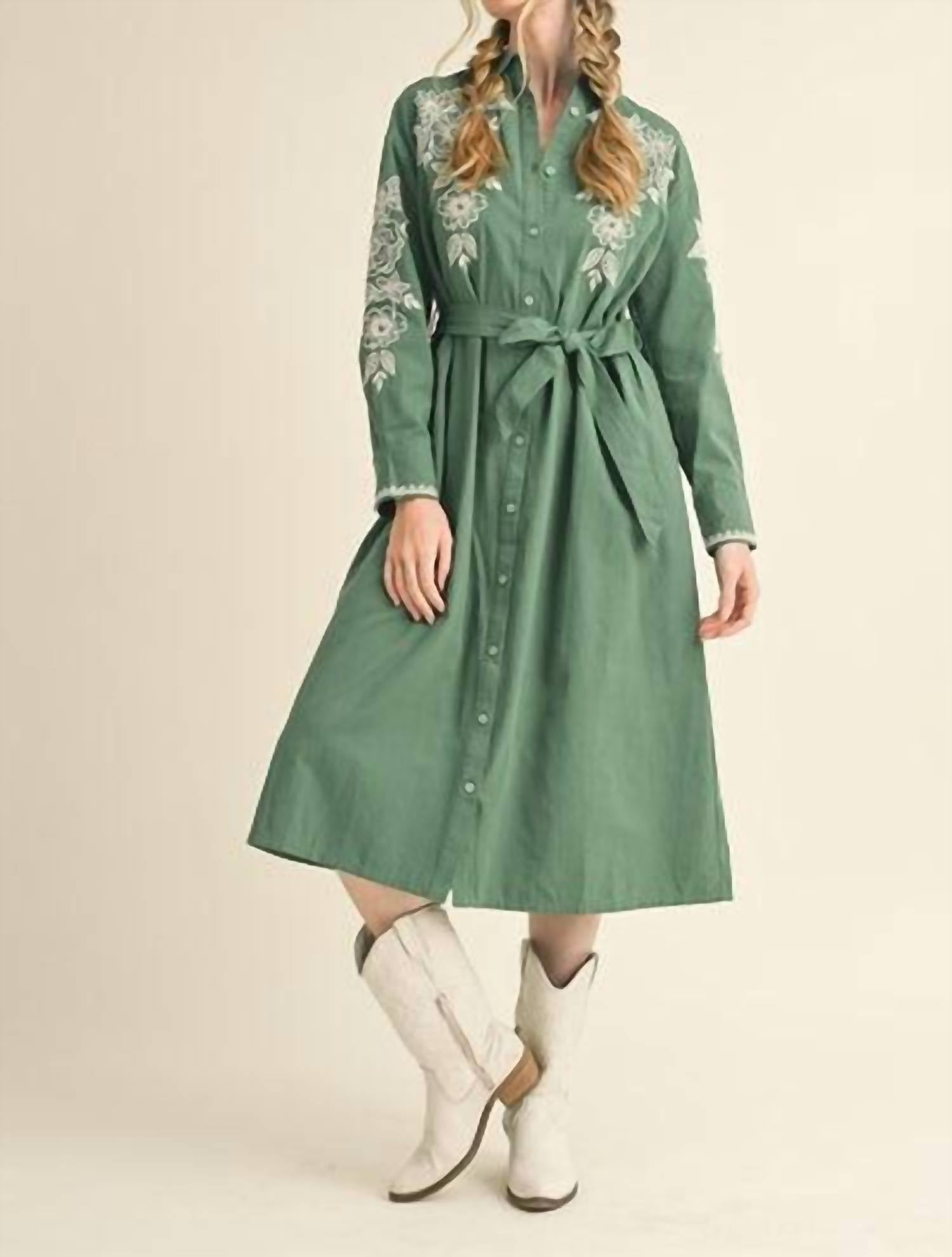 Who doesn't love a good maxi dress? This one you'll be reaching for season after season. Elevate your spring wardrobe with the Saddle Stitch Floral Maxi Dress by &merci, a maximalist statement piece in a rich green hue. This elegant wrap dress features long sleeves and showcases intricate floral embroidery, complemented by a sophisticated collar neckline. Designed without pockets for a streamlined look, it secures with a button closure. Easy to maintain, it's machine washable for your convenience.