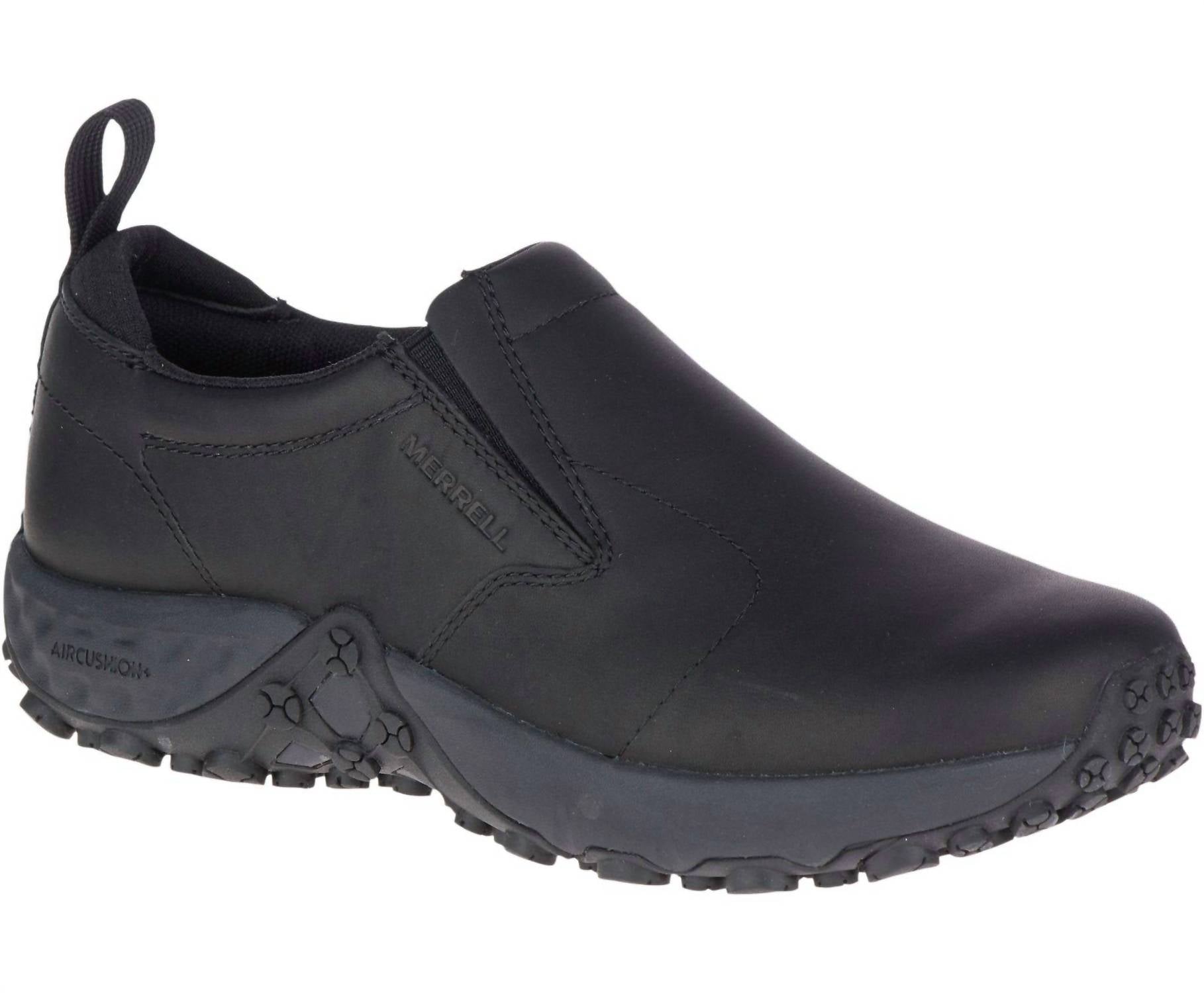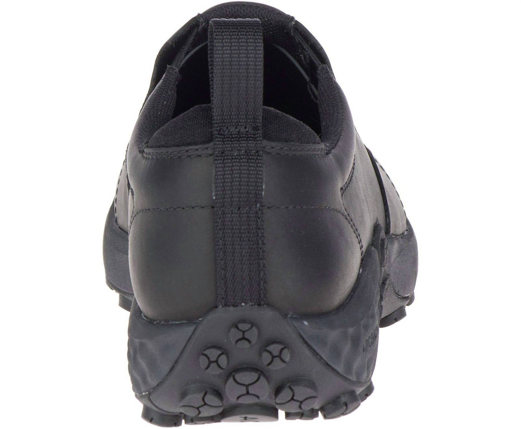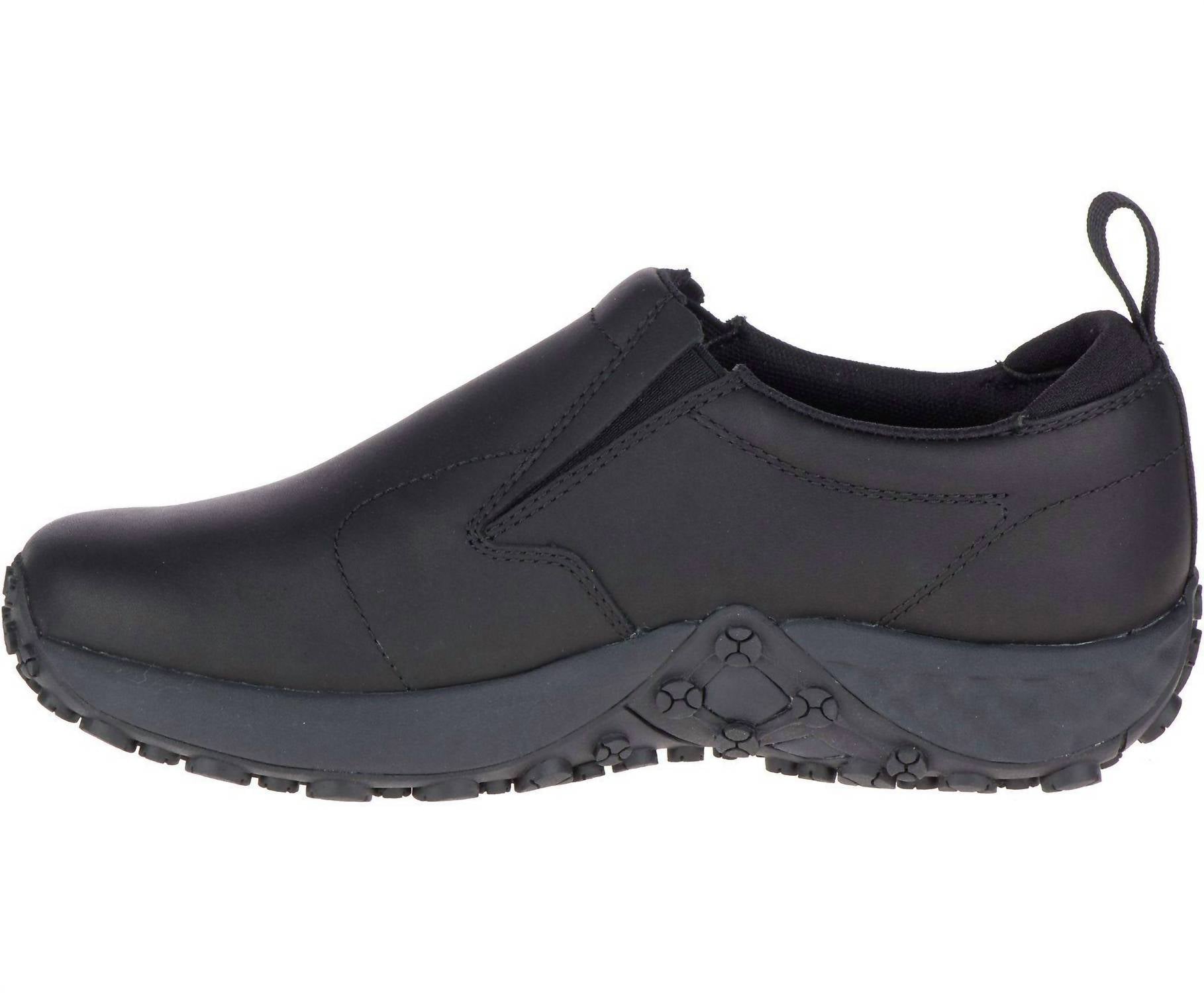 The Women's Jungle Moc Non Slip Work Shoe by Merrell offers unparalleled comfort and protection, perfect for the modern workplace or travel. Constructed from waterproof full grain leather, these black shoes feature the Merrell M Select™ PRO GRIP oil and slip resistant rubber outsole for optimum traction. Its breathable mesh lining and Kinetic Fit™ Base blended EVA contoured footbed deliver advanced comfort, while the Merrell Air Cushion+ system ensures ultimate lightweight support. With a round toe design and a flat heel, these shoes weigh 1lb 5oz (595g) per pair, making them a reliable choice for workwear or travel.