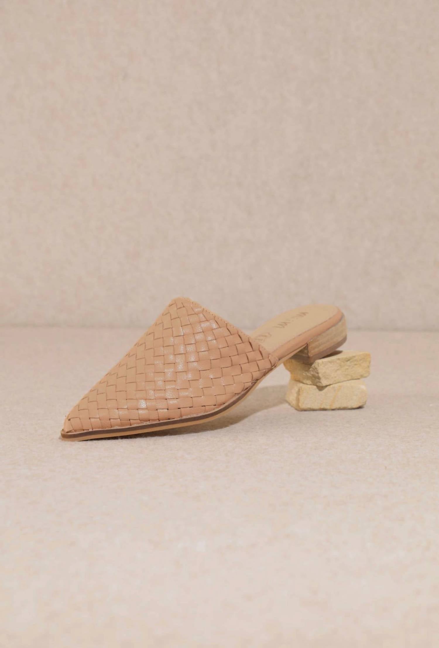 Slip them on and go! Featuring a sophisticated closed pointed toe design in a stunning weave-style vamp. These sandals are crafted from man-made leather with genuine leather insoles, providing unparalleled comfort and style for any occasion. The sandals boast a convenient slip-on style with a heel height of 0.75 inches and a durable rubber sole.