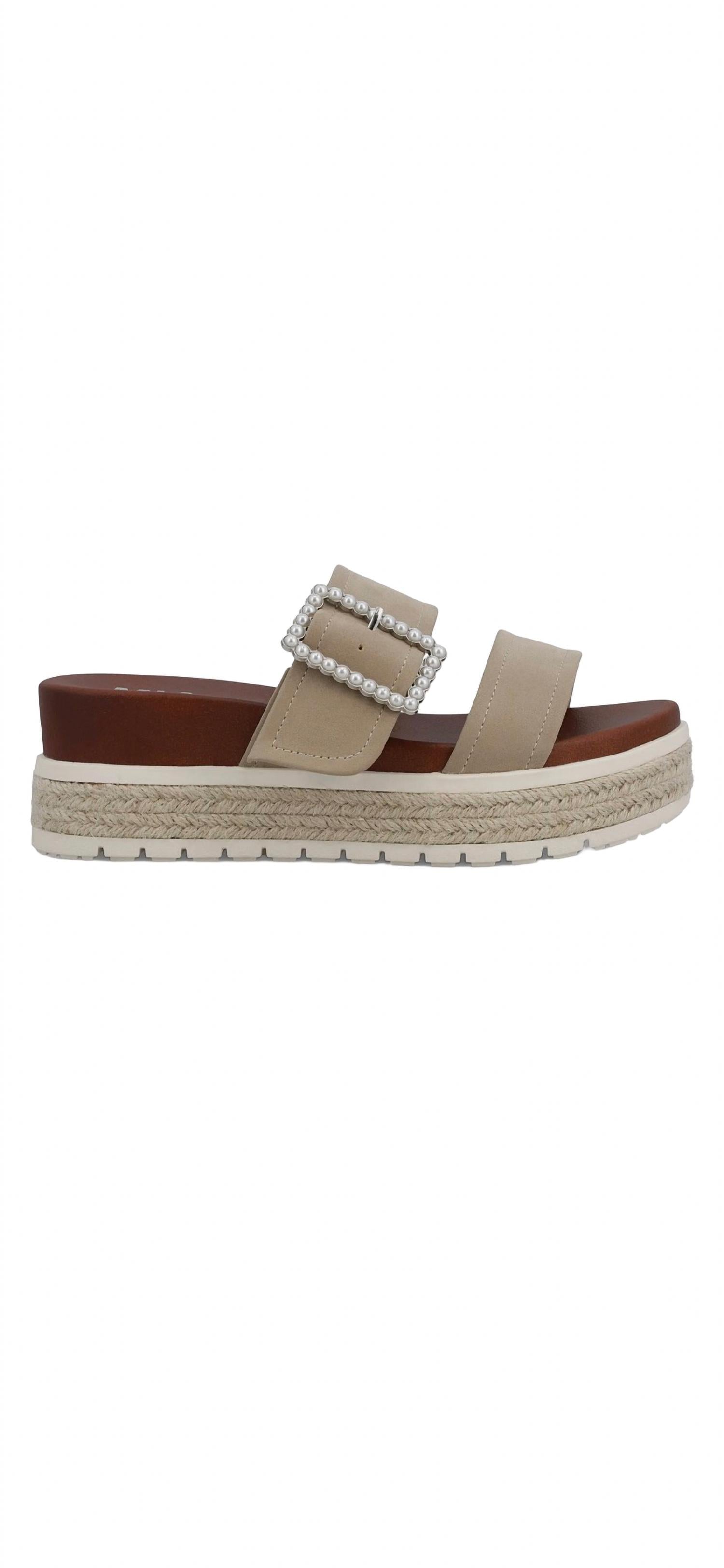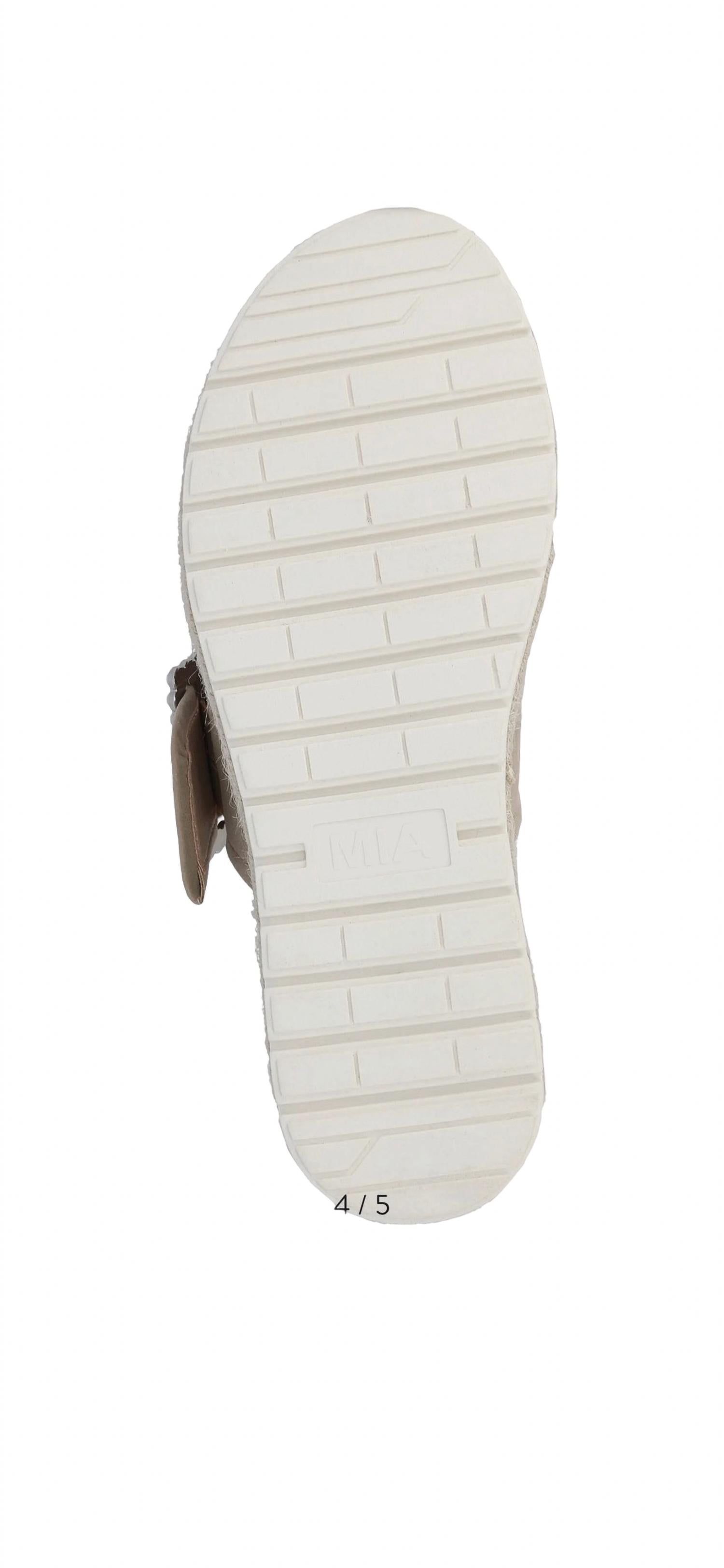 Flowy dresses, cropped pants, and even jumpsuits... this sandal works with them all! Step into comfort and style with the Women's Kika Pearl Sandal by MIA, presented in a versatile sand hue. These chic slide sandals feature a synthetic upper, lining, and sole, elevated by a cushy espadrille-style platform heel measuring 2 1/4 inches, with a 1 1/2-inch platform and a 3/4-inch heel slope. Designed with a cushioned footbed, they offer both luxury and support with every step. Made from durable polyurethane, these sandals are perfect for a Thanksgiving gathering or any occasion requiring a touch of elegance.