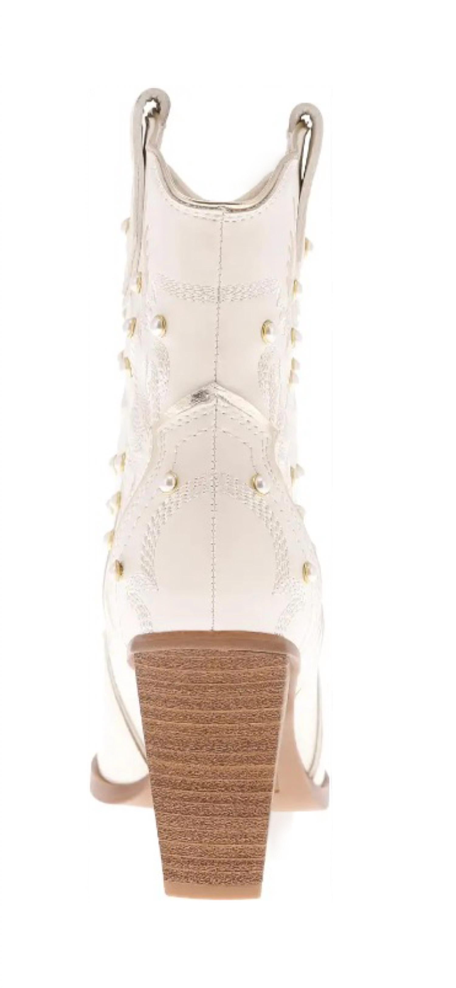 Step out in confidence and showcase your impeccable taste with these fashionable and versatile boots. Their classic style will have you reaching for these boots season after season. Step up your winter style with the Wendi Boots by MIA, designed in a chic white and gold color scheme. These women's heeled boots feature a sleek pointed toe and a comfortable block heel, measuring approximately 3 inches high. Crafted with synthetic material, vegan leather, and intricate stitching, these boots offer a modern aesthetic with a lightly padded footbed for comfort. The synthetic upper and lining ensure durability, with an approximate shaft height of 4.6 inches, and they are finished with a synthetic sole. Ideal for the mid-heel enthusiast, they are best styled for those seeking both elegance and cruelty-free materials.