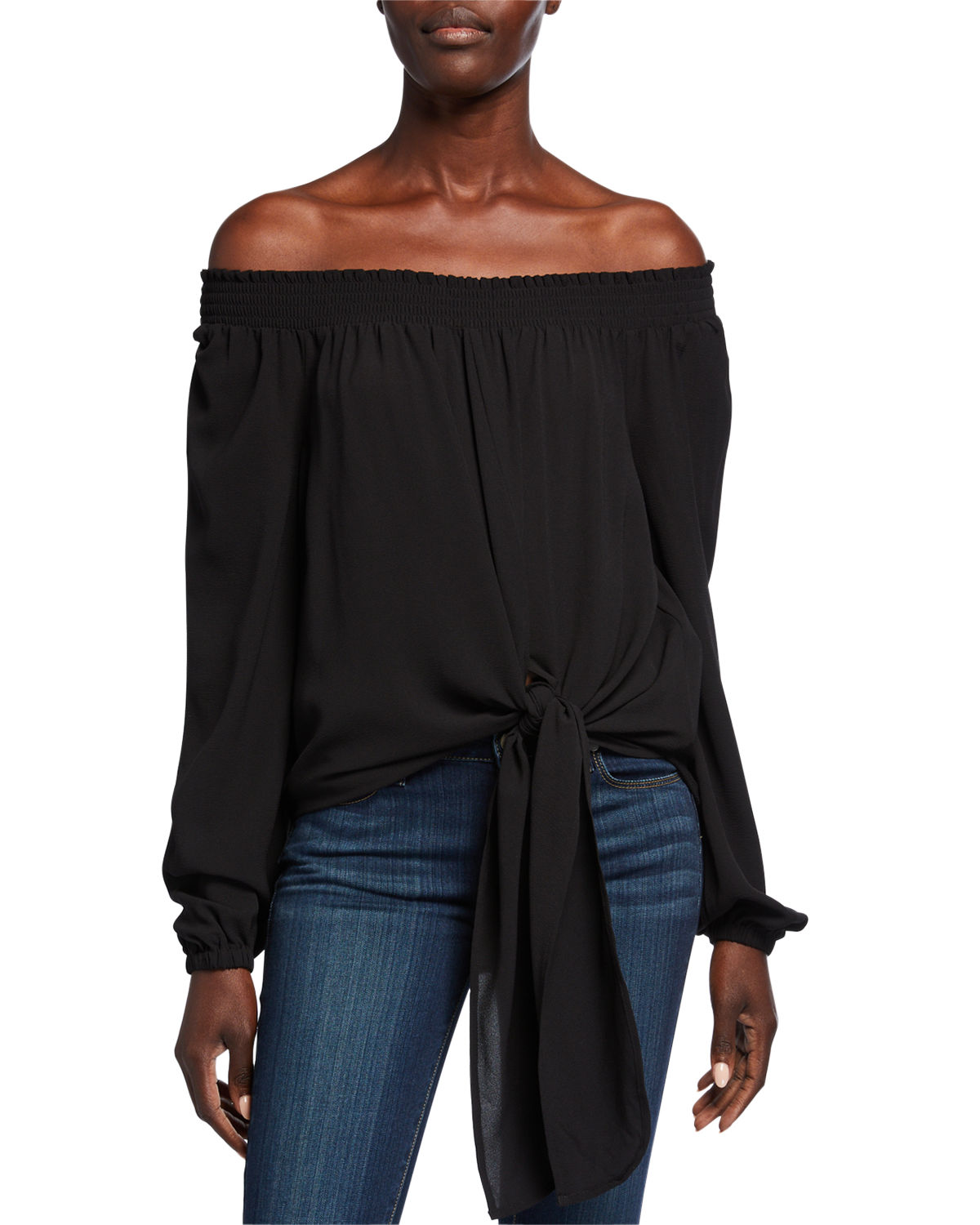 Michael Kors Women's Tie Front Smocked Off the Shoulder Top Black Size Medium