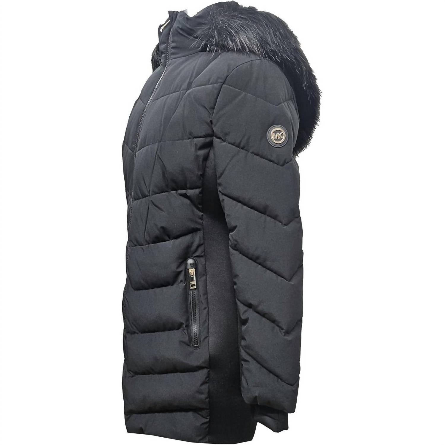 Cozy and cute! This winter jacket is on the top of our favorite's list. Stay stylish and warm with the Scuba Chevron Knee Length Coat by Michael Michael Kors, tailored for women in classic black. This long-sleeve coat is water-resistant and features a zip closure, removable hood, and black faux fur trim for added elegance. Its chevron design creates a slenderizing fit while maintaining comfort in winter weather. Made of imported textured polyester, this coat is dry clean only.