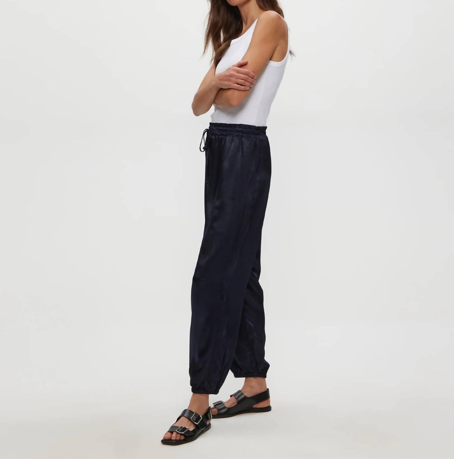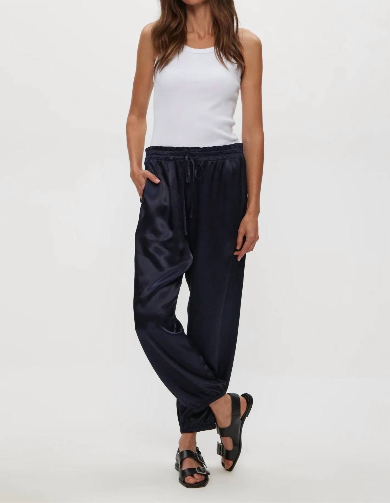 The perfect pant for running around town and looking cool while doing it. Elevate your loungewear collection with the Pixie Jogger Pants by Michael Stars in a chic Nocturnal hue. Crafted from a soft satin finish, these joggers feature a relaxed fit with a tapered leg for a modern silhouette. The design includes an elastic waistband with an adjustable tie and elasticized ankles for a just-right fit and effortless style. Closure: Pull on. Care: Hand wash and line dry. Perfect for summer travel and off-duty days, these joggers seamlessly blend comfort and minimalistic flair.
