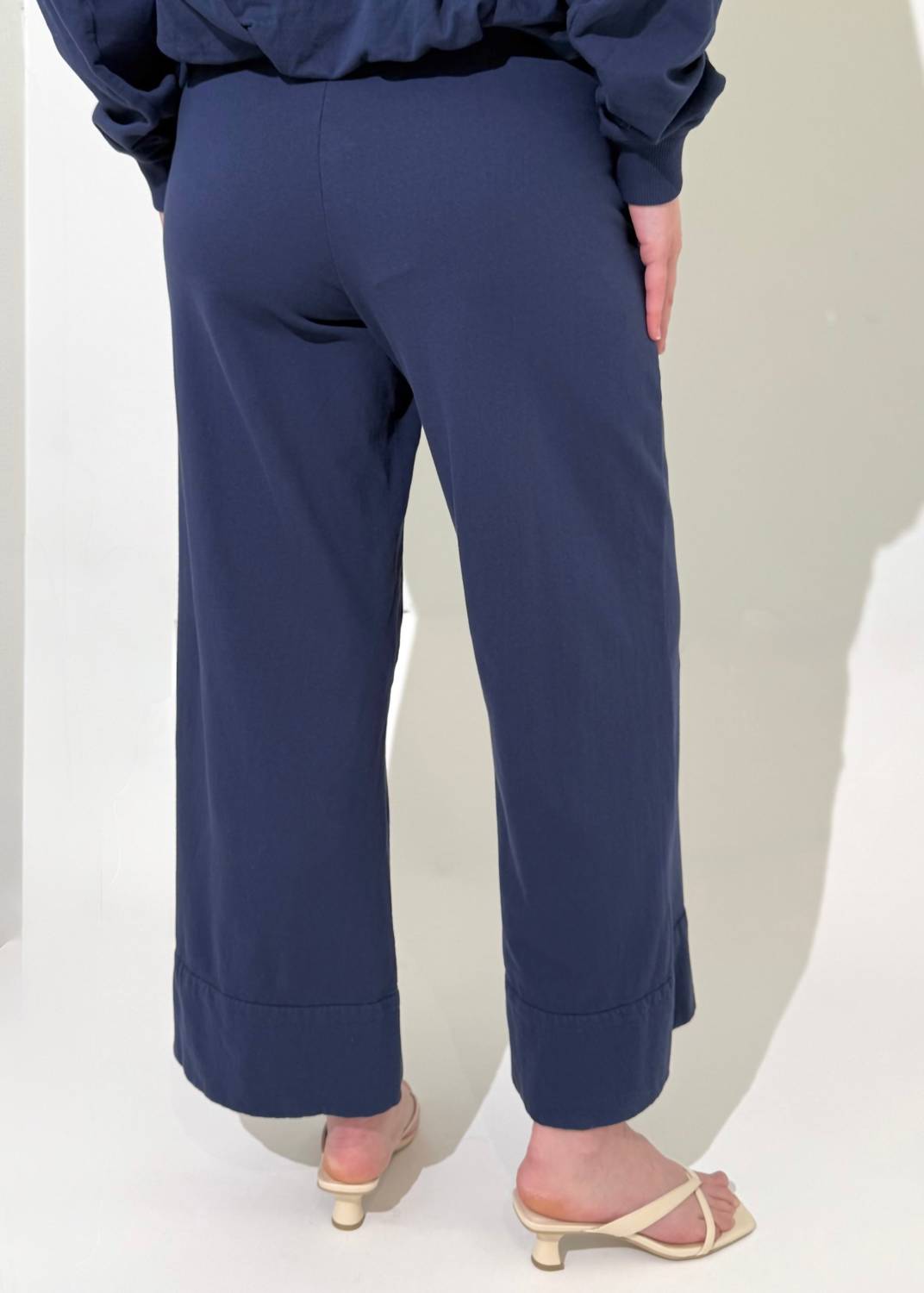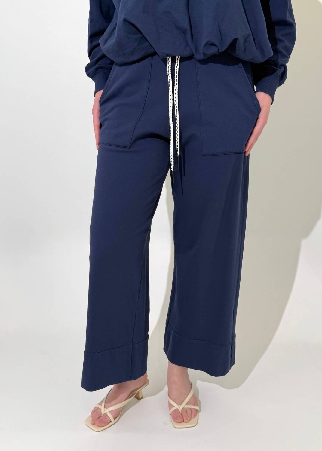 Introducing the Sadie Drawstring Pant by Michael Stars, a quintessential piece for your summer wardrobe in a chic nocturnal hue. Crafted from 100% cotton Signature Trim Terry fabric, these cropped wide-leg pants feature a high-rise elasticized waist with a drawstring tie closure for effortless style and comfort. The relaxed fit includes convenient front patch pockets and a 26.5" inseam. Care for this solid minimalist staple is easy with machine wash and tumble dry instructions.