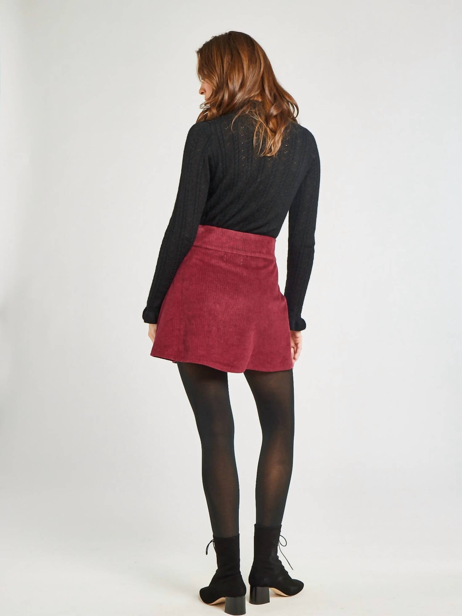 The retro Lorelei mini skirt has a slight A-line shape with a snap front panel and attached front "belt" detail with a round brass buckle. Unlined.
