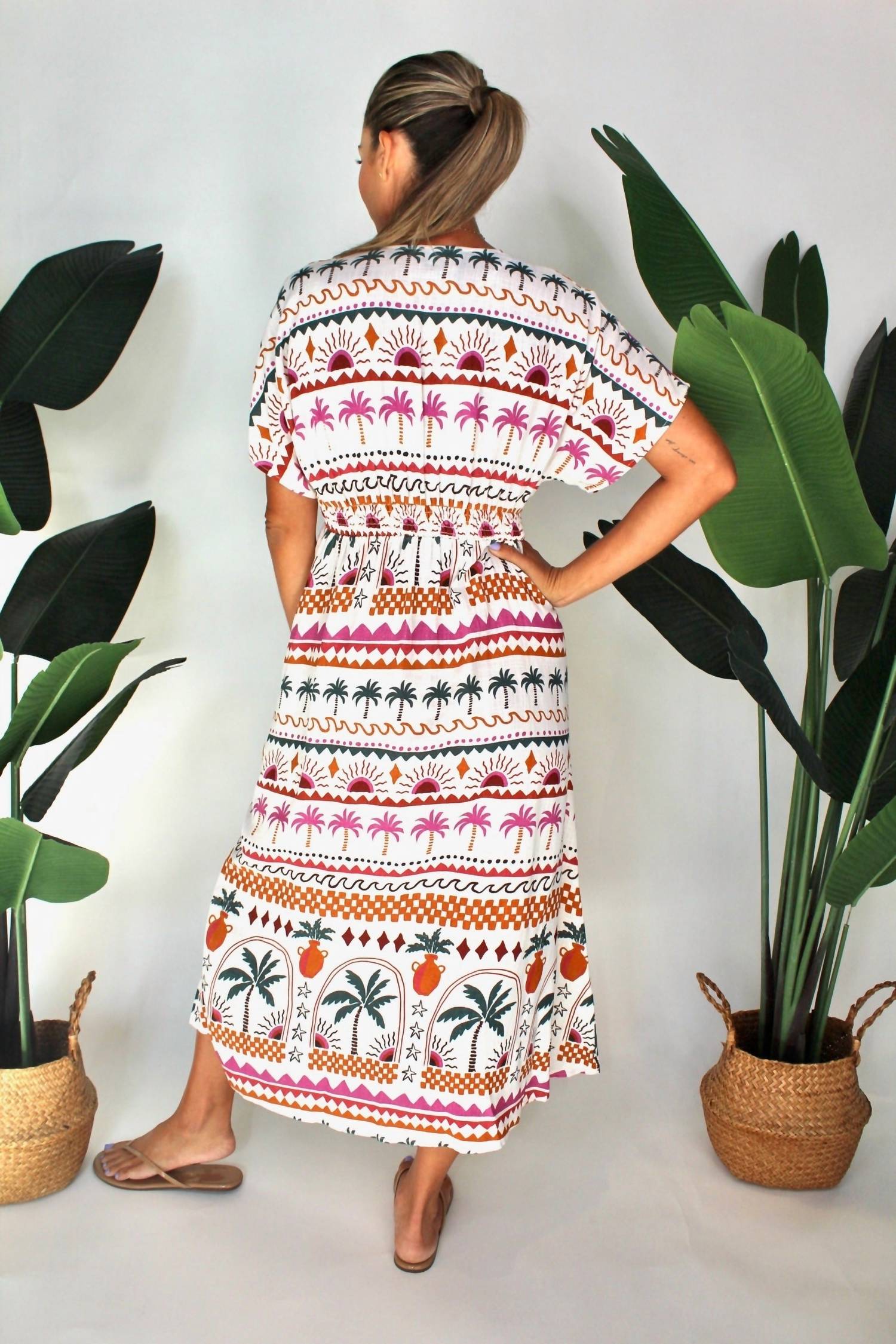 A midi dress so versatile, your options for wearing it are endless. Embrace the season with the MINKPINK Eyona Midi Dress in a vibrant White Palm Print Multi. This women’s dress features short sleeves and an A-line silhouette that complements its low v-neck design, highlighted with a button closure for a touch of elegance. Crafted from a luxe blend of 80% Viscose and 20% Linen, this piece offers comfort and style. For best care, hand wash in cold water and line dry in the shade. Alyssa, who is 5'10", is shown wearing a size small.