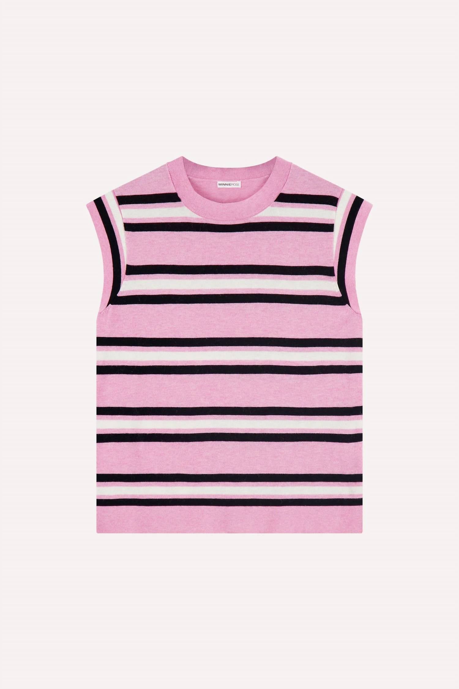 You'll be reaching for this comfy and classic v-neck sweater all season long. Elevate your wardrobe with the Supima Cotton Cashmere Multi Stripe Cap Sleeve Crew by Minnie Rose, designed in a vibrant navy finish. This cap-sleeve top boasts a luxurious blend of 85% cotton and 15% cashmere, offering both softness and sophistication with playful multi-color stripes. The pull-on design provides ease of wear, and it fits true to size with no pockets to ensure a streamlined appearance. For care, choose between dry cleaning or hand washing. Model is 5'9" and wearing a size small.