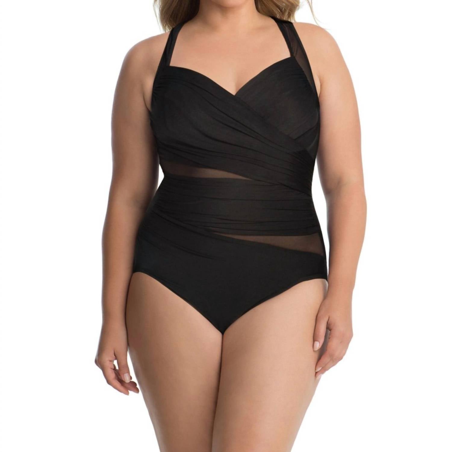Designed to perfection and fit to flatter. You are going to love this one piece swimsuit. Discover the Miraclesuit Net Work Madero One Piece Swimsuit, a stunning plus-size swimwear choice that promises to enhance your silhouette. Crafted from a 69% Nylon and 31% Lycra Spandex blend, this black swimsuit features a flattering surplice V-neckline and a shirred crossover bodice with mesh cut-outs for a visually slimming effect. Adjustable shoulder straps allow for a personalized fit alongside a supportive underwire bra. Ideal for summer travels with its trend-forward quiet luxury look, this textured one-piece offers adjustable coverage with a moderate leg cut and scoop back design.