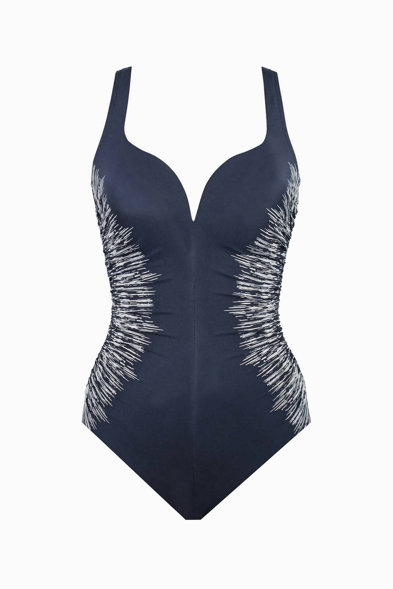 This one piece fits like a glove and covers all the right areas. Introducing the Miraclesuit Temptress One Piece Swimsuit in a striking Midnight Blue and white paisley pattern, designed to sculpt and slim for an enviable silhouette. This swimsuit features a soft cup bra accommodating up to a D-cup, a curved V-neckline, fixed straps, and a scoop back for a sleek and supportive fit. Made with a combination of Miratex fabric, 69% nylon and 31% LYCRA® spandex drape, and 84% nylon and 16% LYCRA® spandex body, it offers allover body control and an hourglass effect with engineered print and side shirring. Perfect for a summertime beach day, this piece embodies athleisure chic and full coverage support.