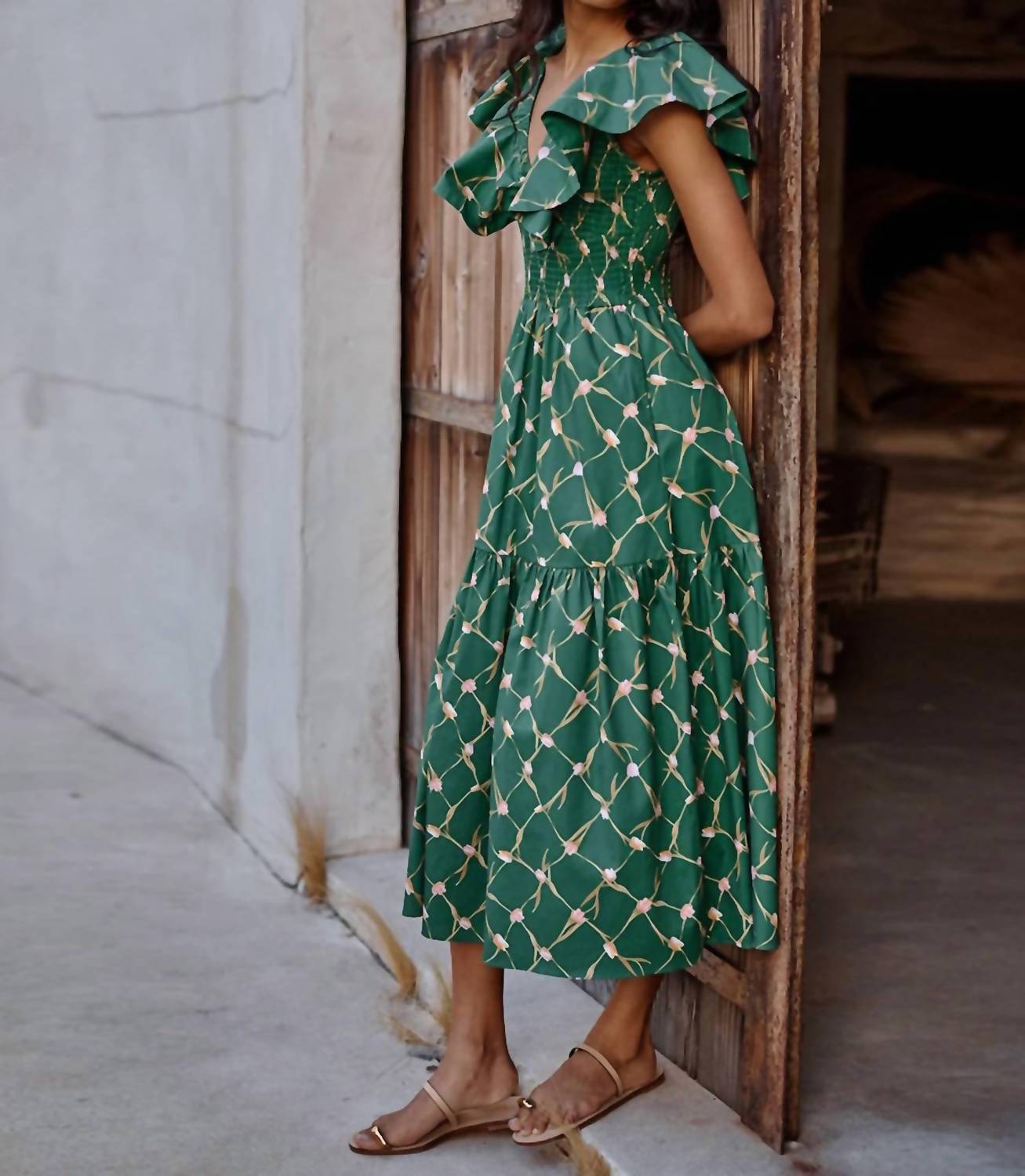 Introducing the Leona Dress by Misa Los Angeles, a chic and versatile addition to your wardrobe. This midi-length dress is crafted from a Tulip Lattice printed cotton poplin blend, composed of 97% cotton and 3% spandex. Featuring a deep V-neckline, a smocked bodice with a feminine ruffle, and a tiered skirt with side slit pockets, this dress effortlessly transitions from day to night. Made in the USA, it offers a cap sleeve design and pull-on closure, with care instructions for dry clean only. Model wears size XS (5'8.5" height, 32" bust, 25" waist, 34.5" hips).