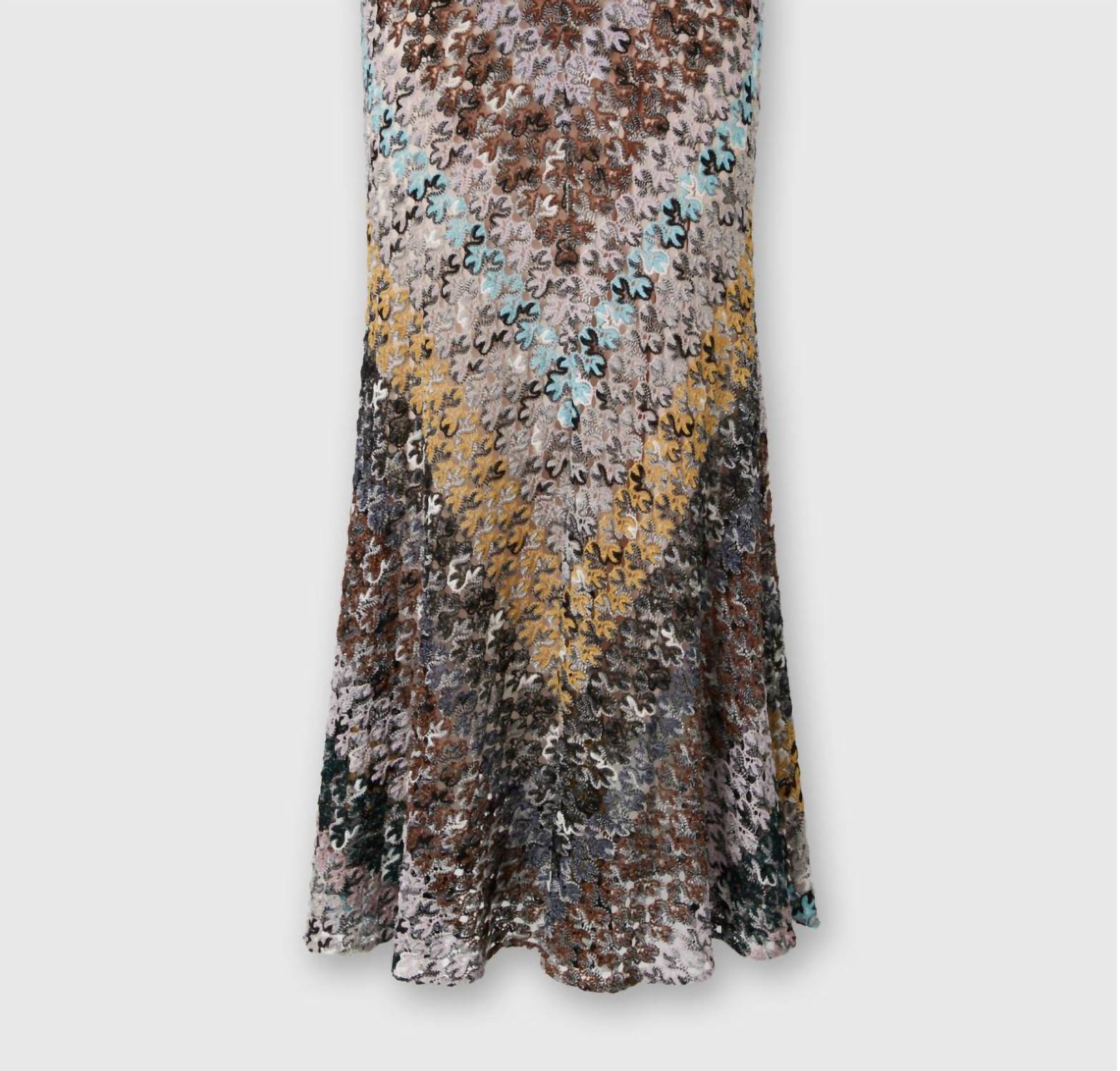 Elevate your wardrobe with the Missoni Flared Long Skirt In Lace, a stunning piece in multicolor tones perfect for any vacation getaway. This women's skirt features a textured pattern and an A-line design, falling gracefully for a feminine silhouette. Crafted from a 92% viscose/rayon and 8% metallized blend, it effortlessly embraces the maximalist trend of spring. The pull-on style offers ease and comfort, with care recommendations of dry cleaning only and ironing at a maximum temperature of 230 degrees Fahrenheit without steam.