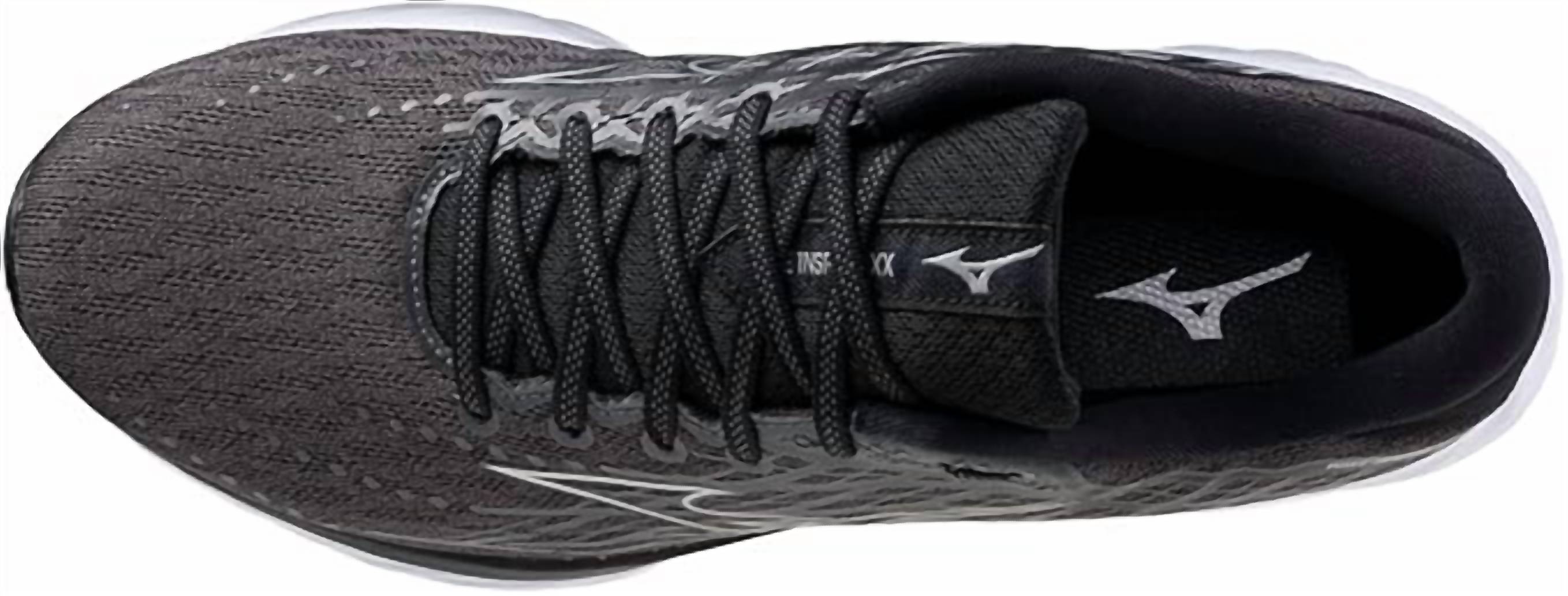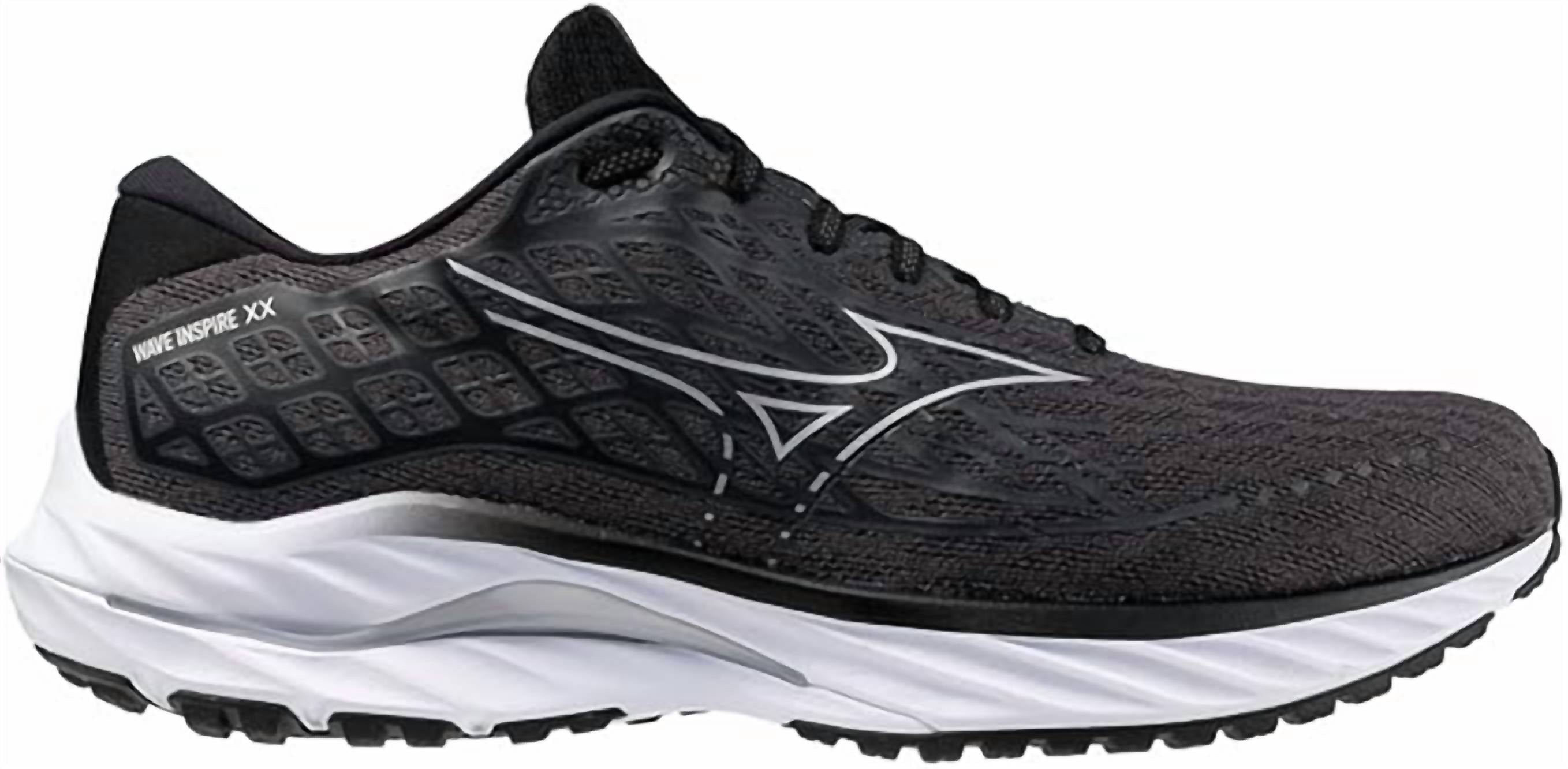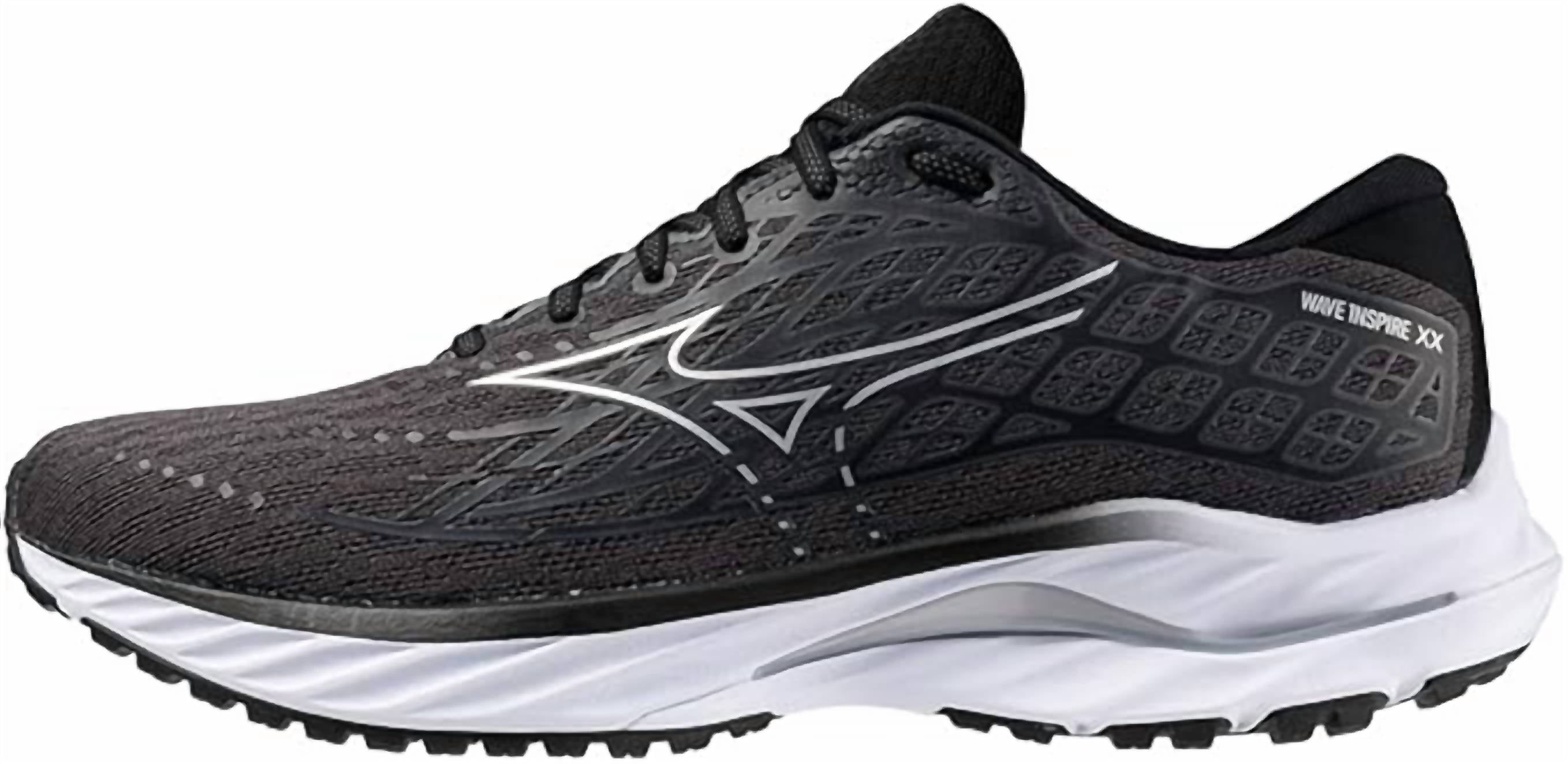 Introducing the Men's Wave Inspire 20 Sneakers by MIZUNO, a high-performance choice in ebony/white. These sneakers feature a jacquard mesh upper with a gusseted tongue, providing a secure and comfortable fit. The MIZUNO WAVE plate and MIZUNO ENERZY foam enhance cushioning and stability, while the X10 outsole offers increased durability for extended wear. Perfect for men's athletic routines, these sneakers are designed to improve your performance capabilities.
