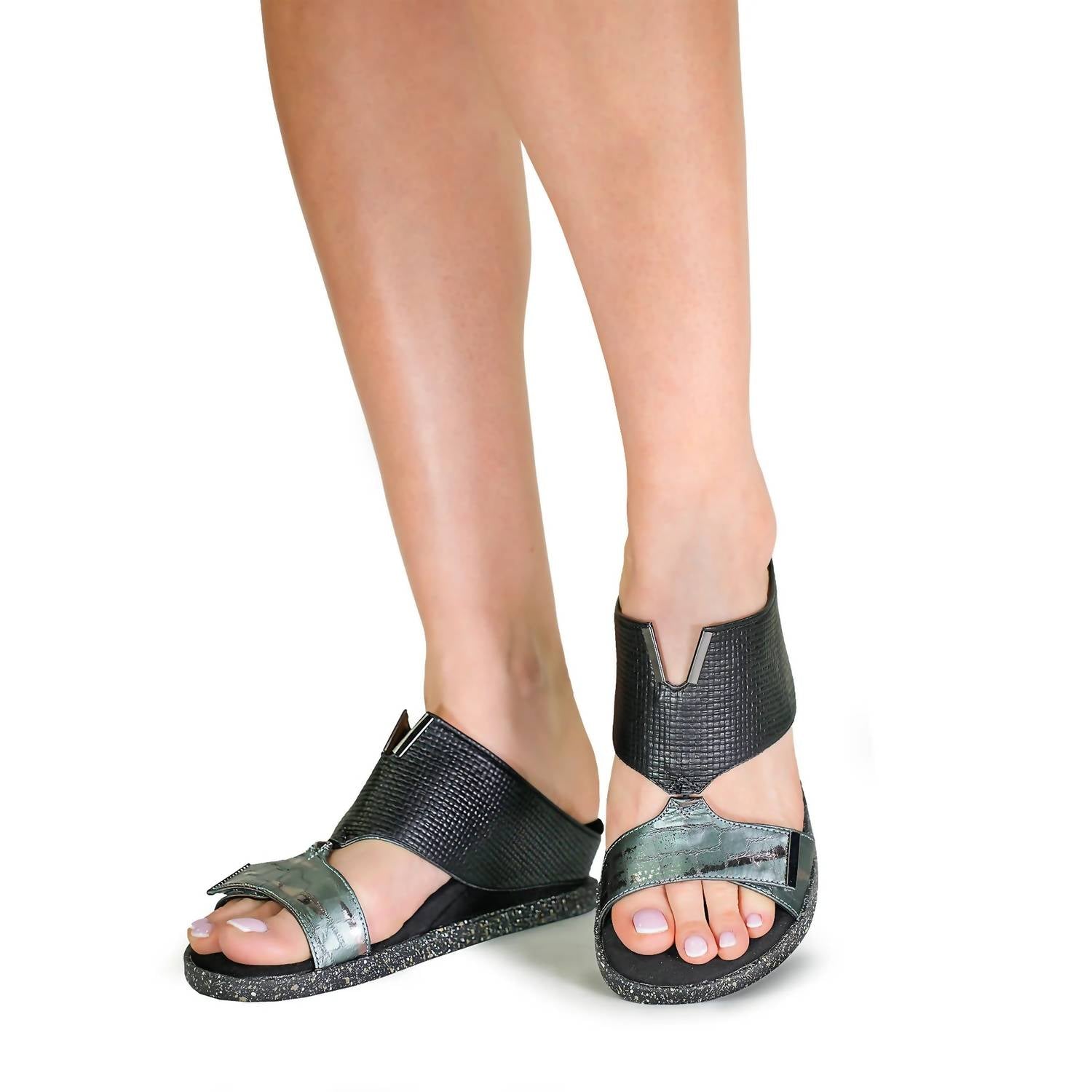 This sandal will take you from brunch to dinner and everything in between.Introducing the Women's Kelo Reversible Metallic Slide from Modzori – the ultimate blend of style and versatility in one chic sandal. Crafted in a stunning Teal/Black color combination, this innovative low-wedge design seamlessly adapts to your ever-changing wardrobe. Featuring sophisticated hardware accessories and an adjustable front t-strap with a convenient velcro closure, this sandal offers unparalleled comfort and customization. With its reversible feature, you can effortlessly switch sides to match any outfit, making it a perfect companion for every fashion-forward woman. Embrace endless possibilities and redefine your style with the Kelo Reversible Metallic Slide – where fashion meets function with a touch of bold elegance. Transform your look with every step and make a statement in these must-have sandals.