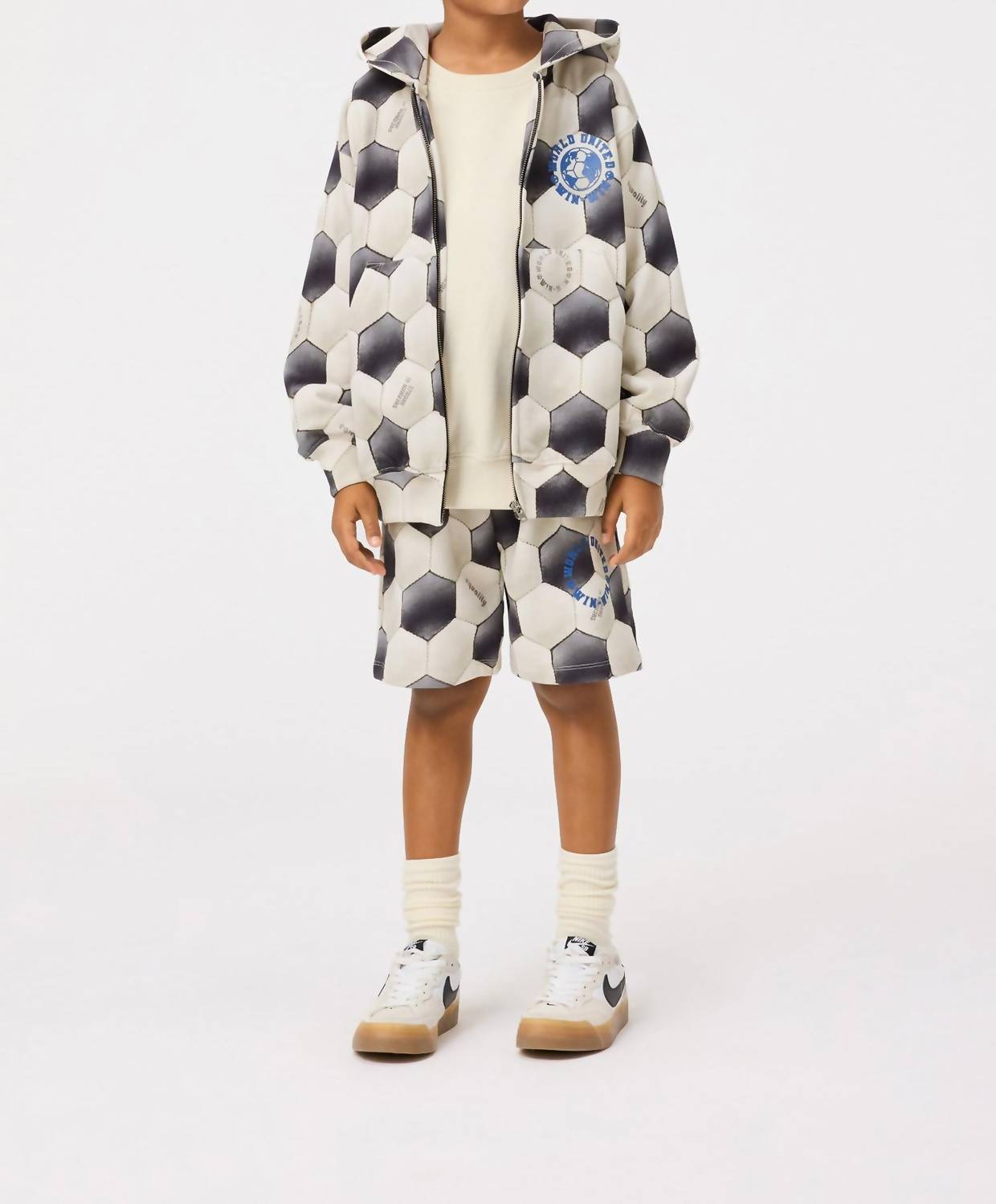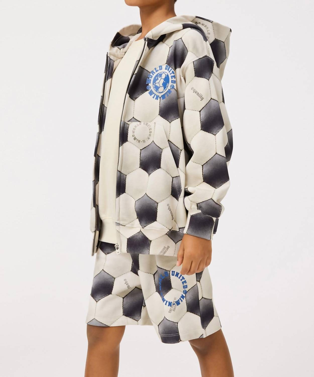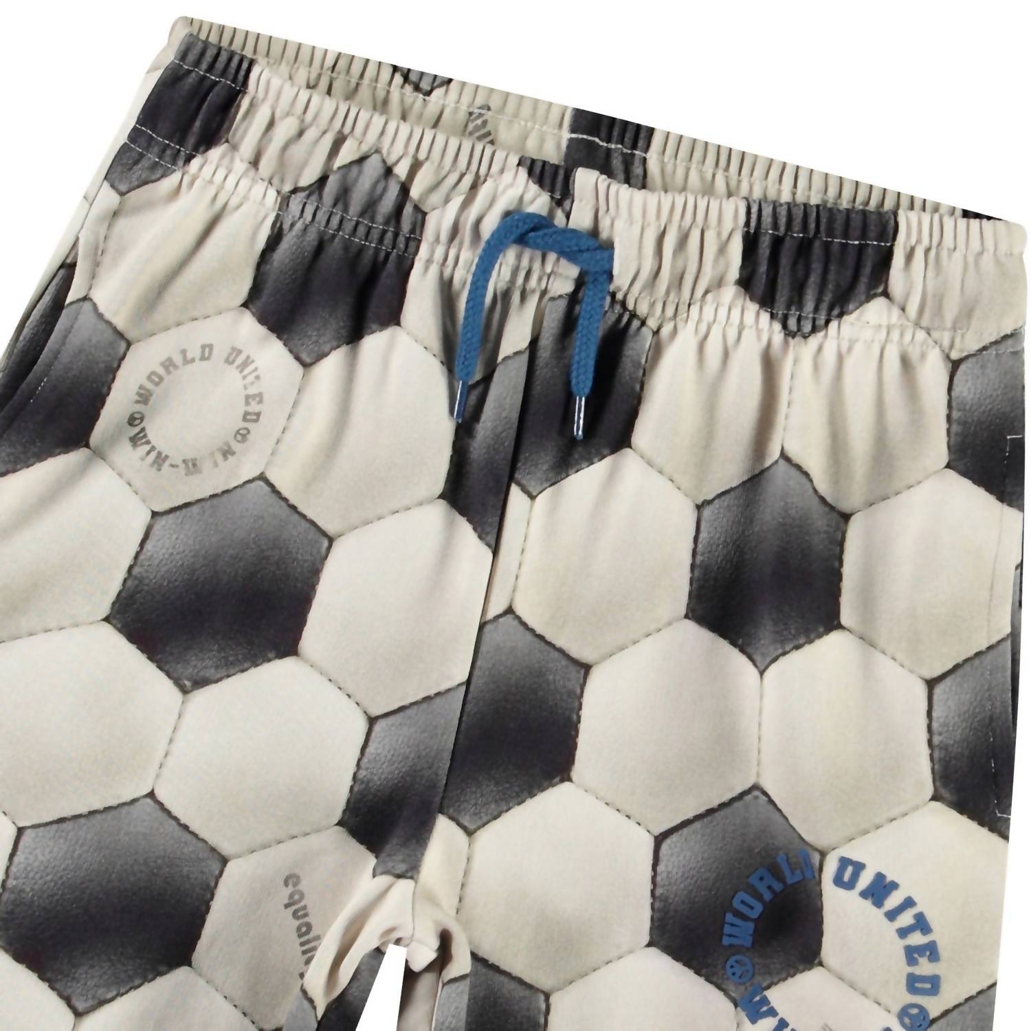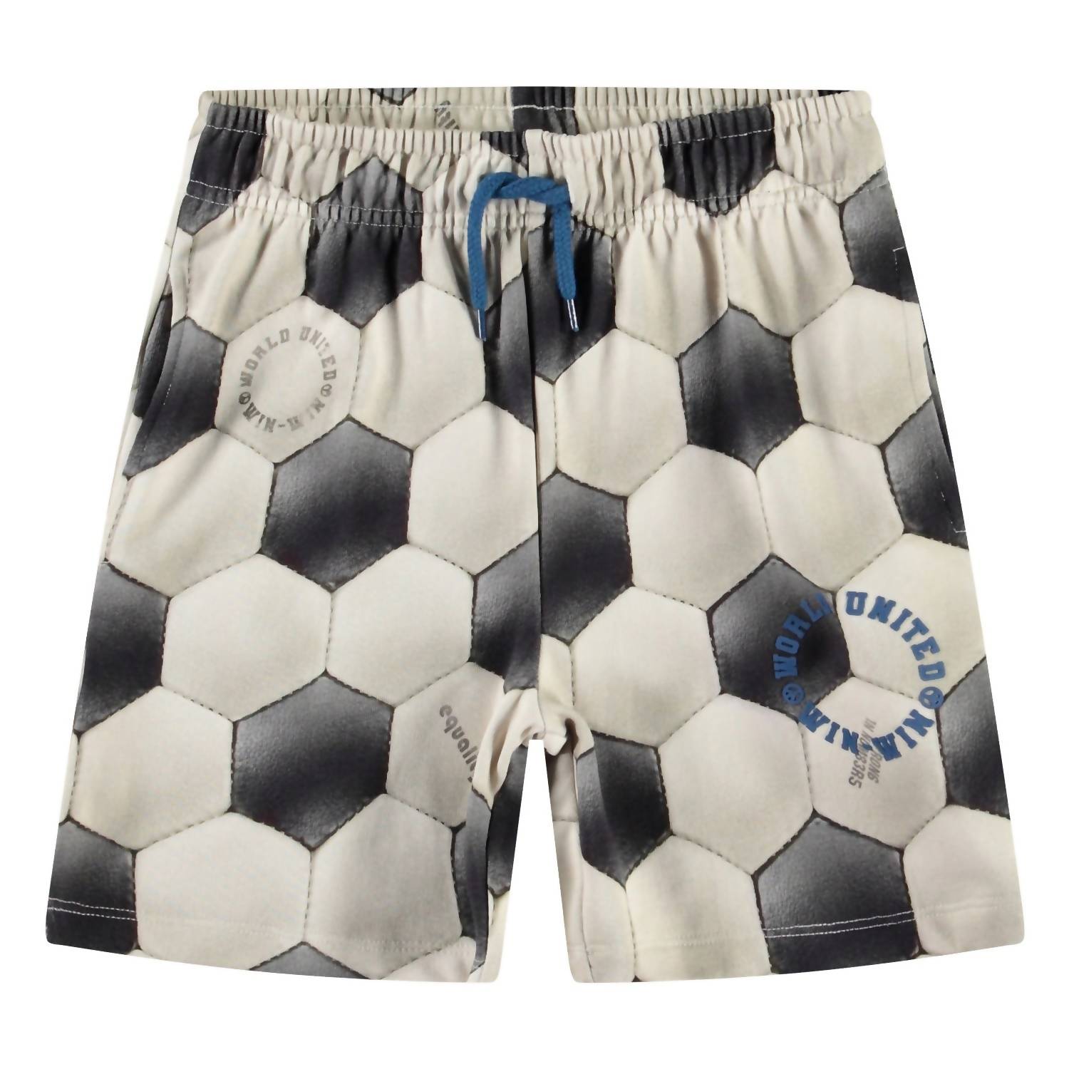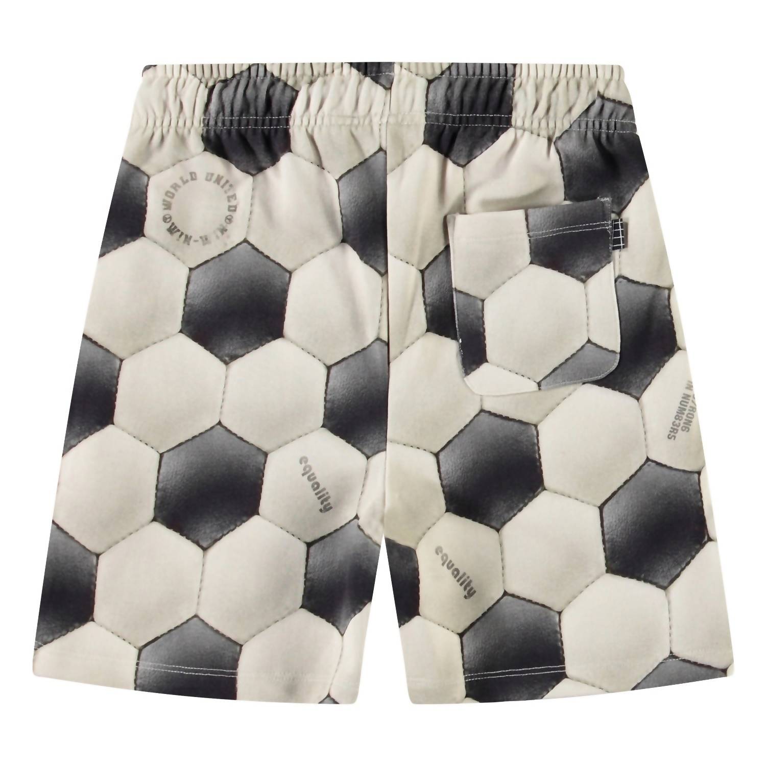 Introducing the Boy's Adian Short Football Noise by Molo, the perfect game day essential for a sporty look. These black and white shorts feature a regular fit with wide legs, reaching the knee, and are crafted from 100% organic cotton for sustainable comfort. Designed with an elastic waistband and inner drawstring, they offer utility with side and back pockets and a unique football print accent with the text 'World United Win Win'. Care: Machine washable for easy maintenance.