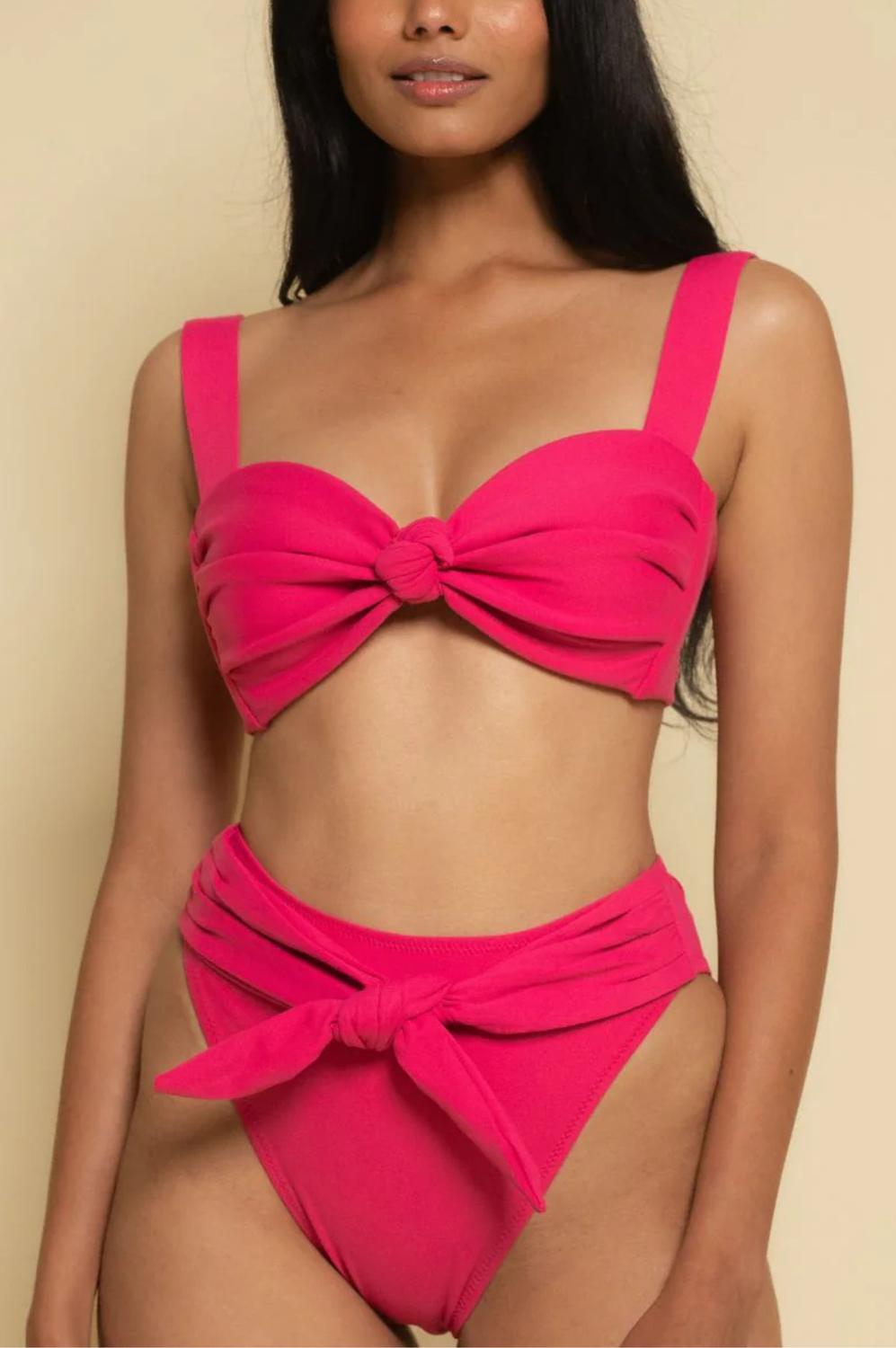 Dream of your next beach getaway in this cute little number. Pair with strappy sandals, a floppy hat, and an oversized tote to complete the perfect vacation look. The Montce Hayden Bikini Swim Top in a vibrant raspberry hue is the ultimate versatile piece for your summer wardrobe. Designed with high support and an adjustable back hook closure, it features wide adjustable shoulder straps and side-seam boning for added comfort and support. The flattering sweetheart neckline and bralette silhouette are enhanced by ruched and pleated details, with a stylish center knot and gold tarnish-resistant metal hardware. Crafted from an 85% Supplex FD and 15% Extra Life Nylon blend with UV protection UPF 50+, this top can be hand washed, making it perfect for a boho chic beach day or as an athleisure apparel top.