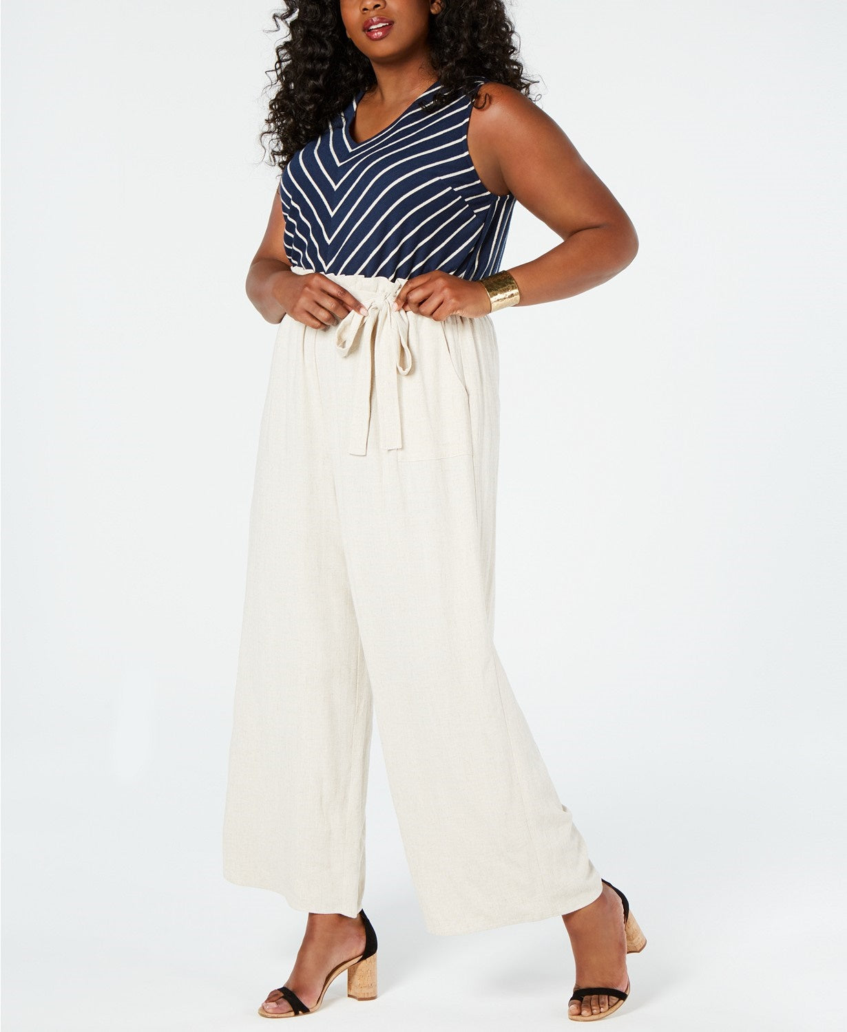 Approx. model height is 5'10" and she is wearing a size 2X|Approx. inseam: 28"|Wide leg|V-neck; Pullover styling with keyhole and button closure at back|Hip pockets; paperbag waist with self-tie belt; belt loops|Unlined|Top: polyester/cotton; pants: rayon/linen