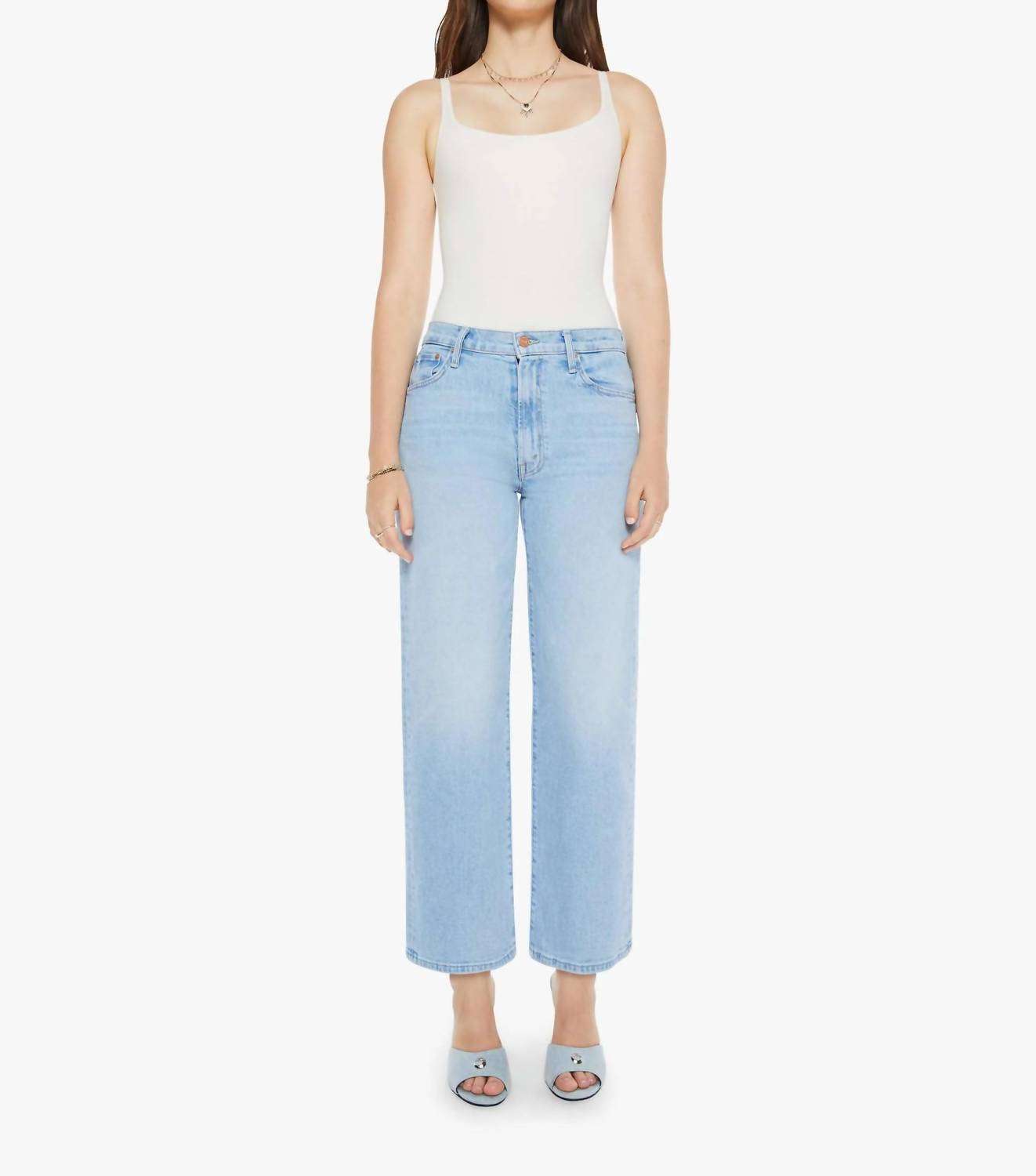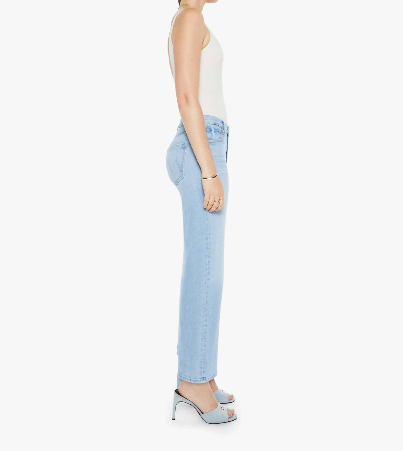Introducing the Dodger Ankle Jean by Mother, a chic addition to your spring wardrobe with a trend-forward workwear appeal. Crafted in a solid light wash GETTOG color, these jeans are designed with a relaxed fit and a slouchy silhouette, sitting low on the hips with a mid-rise and a loose straight leg. Closure: Button closure. Elevate your look by pairing with your favorite tops, while enjoying the added convenience of functional pockets. Care: Machine wash and tumble dry for easy maintenance. With dimensions of an 11 1/4" rise, 28 3/4" inseam, and 19 3/4" leg opening, these jeans offer both style and comfort.
