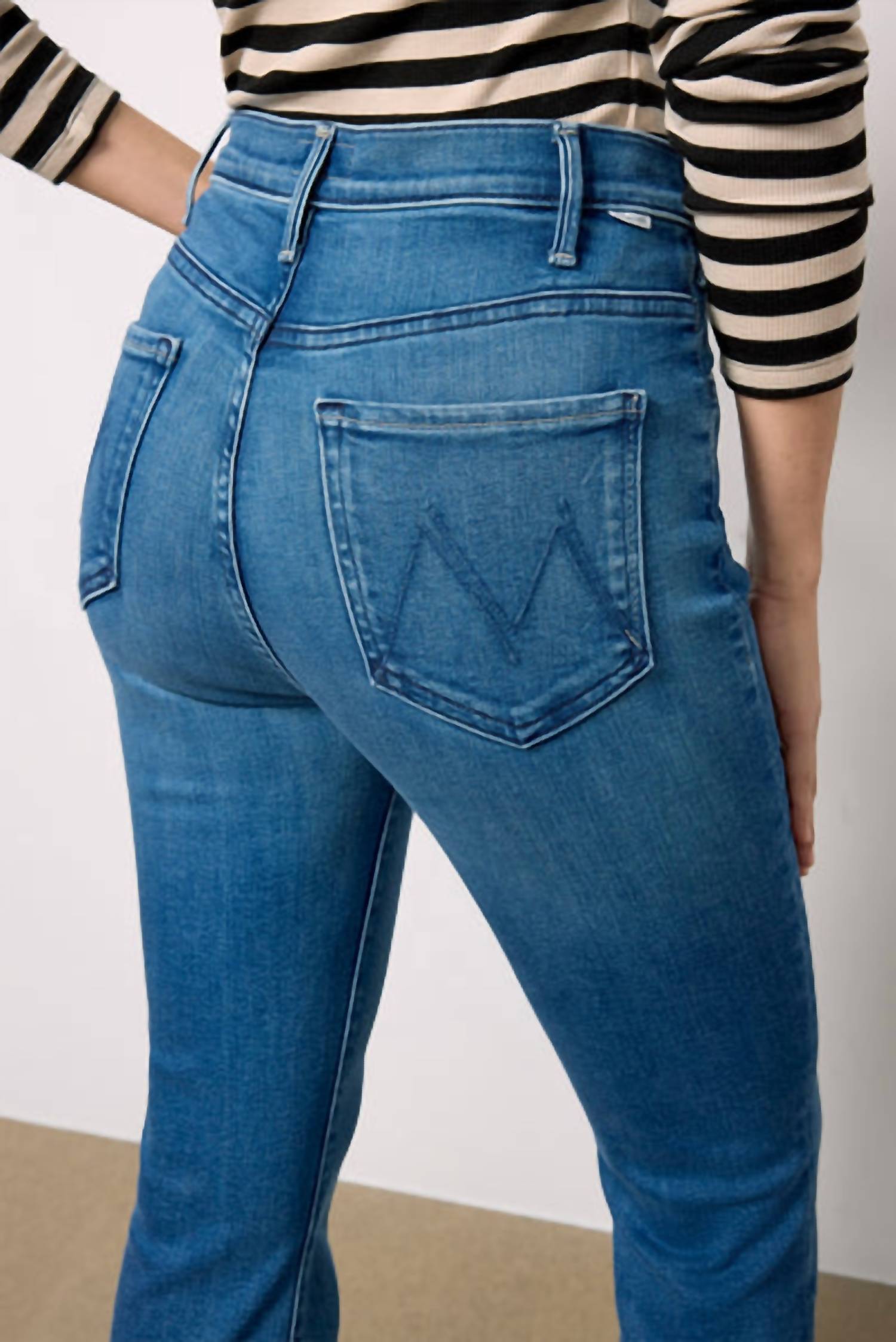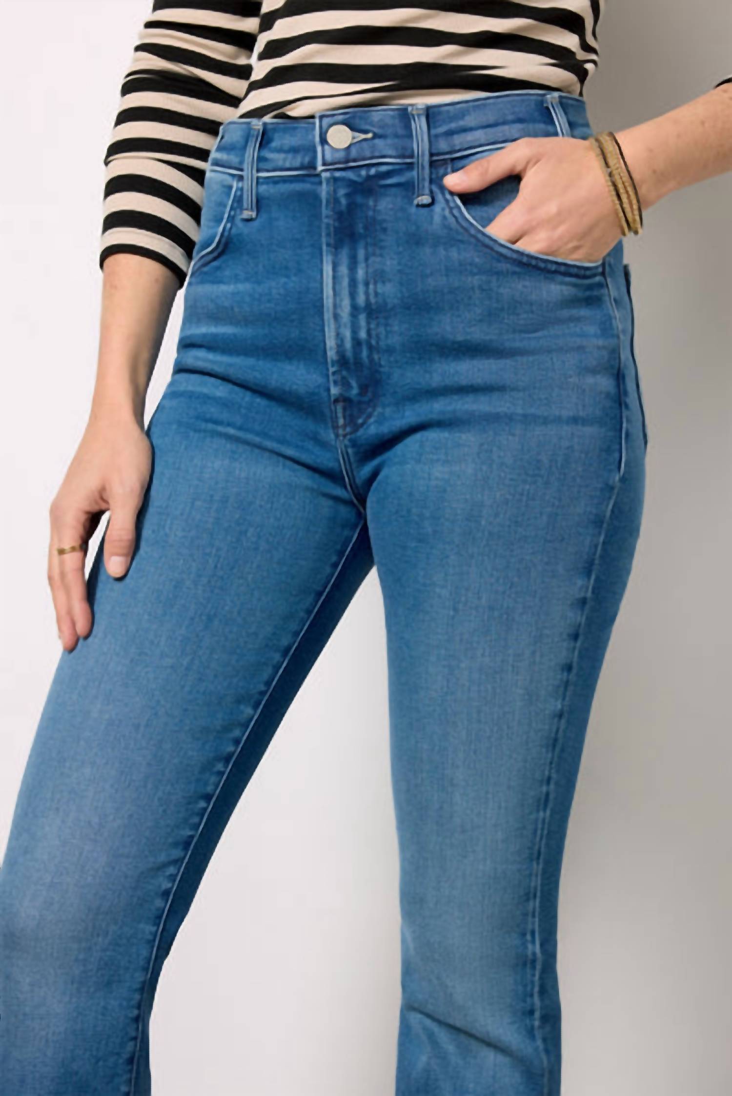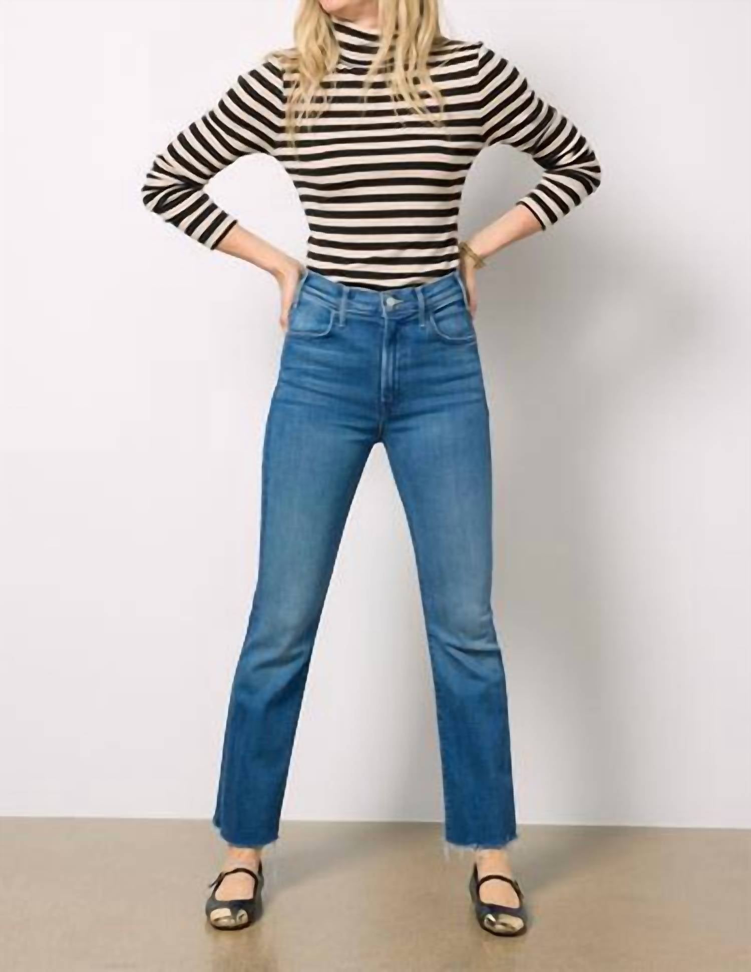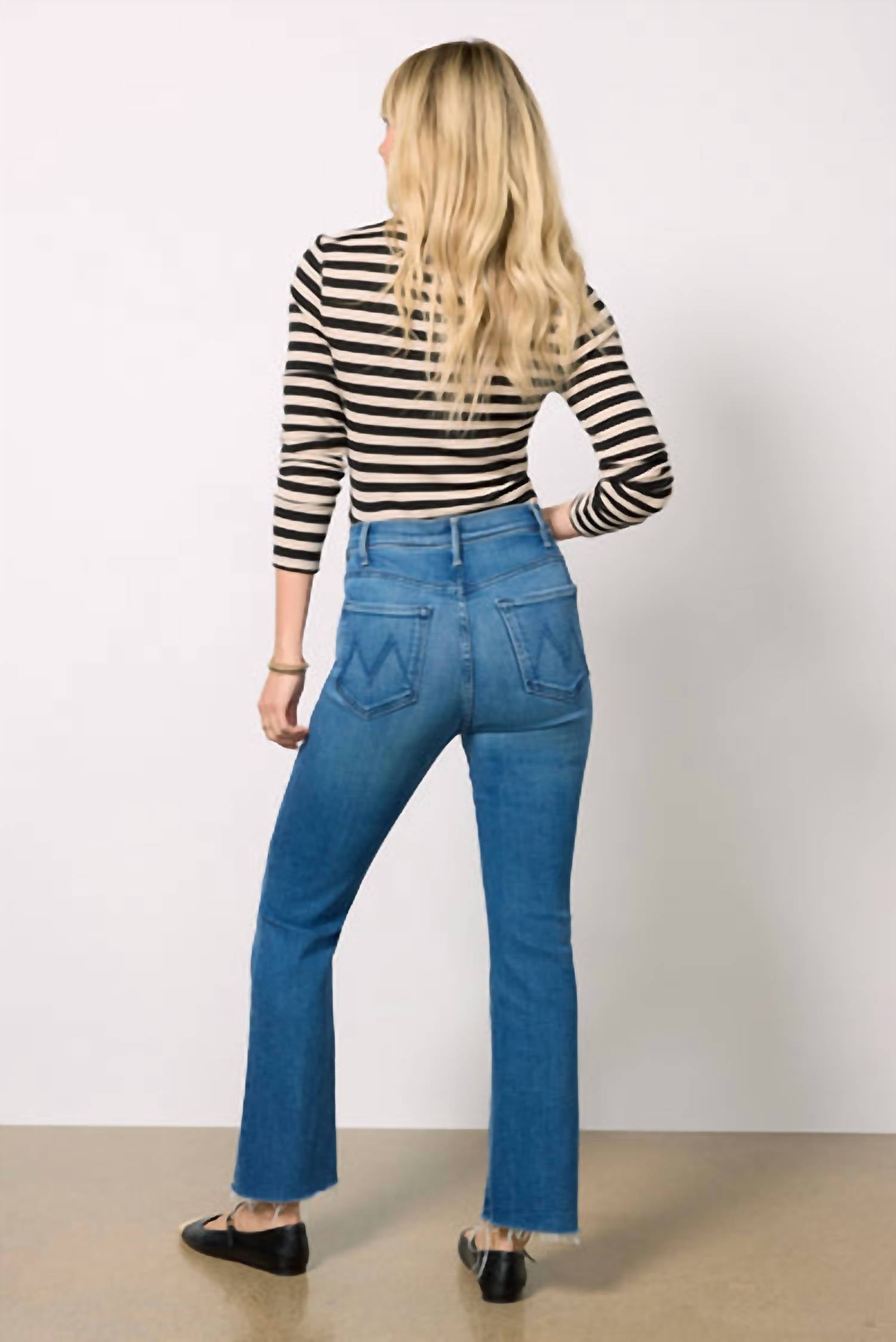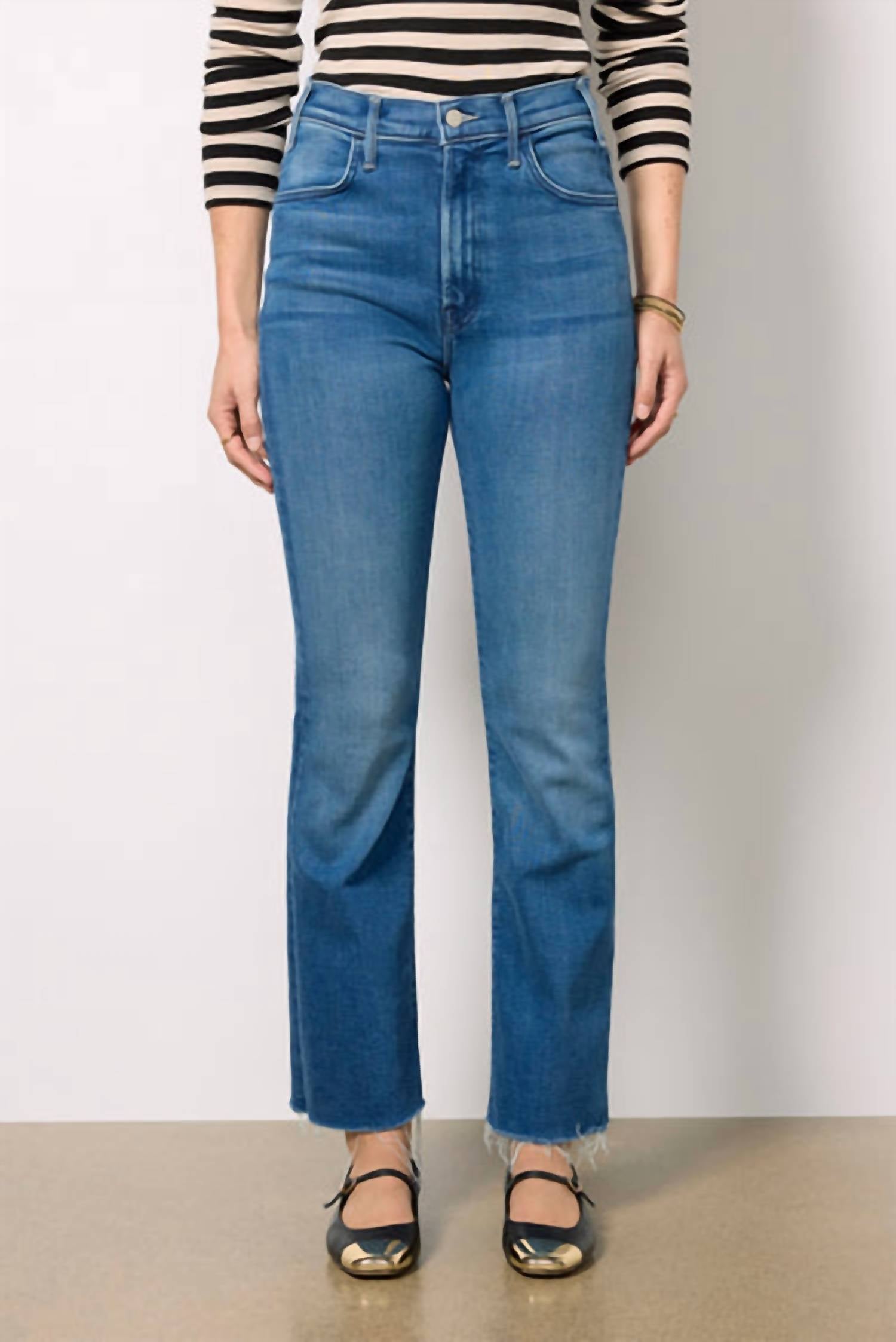 A boot-cut jean that not only looks good on, you'll be comfortable in them all day. Discover the Hustler Flood Fray jeans by MOTHER, tailored for a chic yet comfortable fit in the 'Whatever You Want' blue. These jeans feature ankle-length raw hems and a high waist rise with a flattering 11" front rise, and a subtle bootcut silhouette. Crafted from a blend of 78% cotton, 16% modal, 4% polyester, and 2% elastane, these solid pattern jeans promise comfort with soft stretch denim. Closure: Zip fly. Care: Machine wash warm and hang to dry. Waist measures 16 1/4" in leg opening with an inseam of 28 1/4".