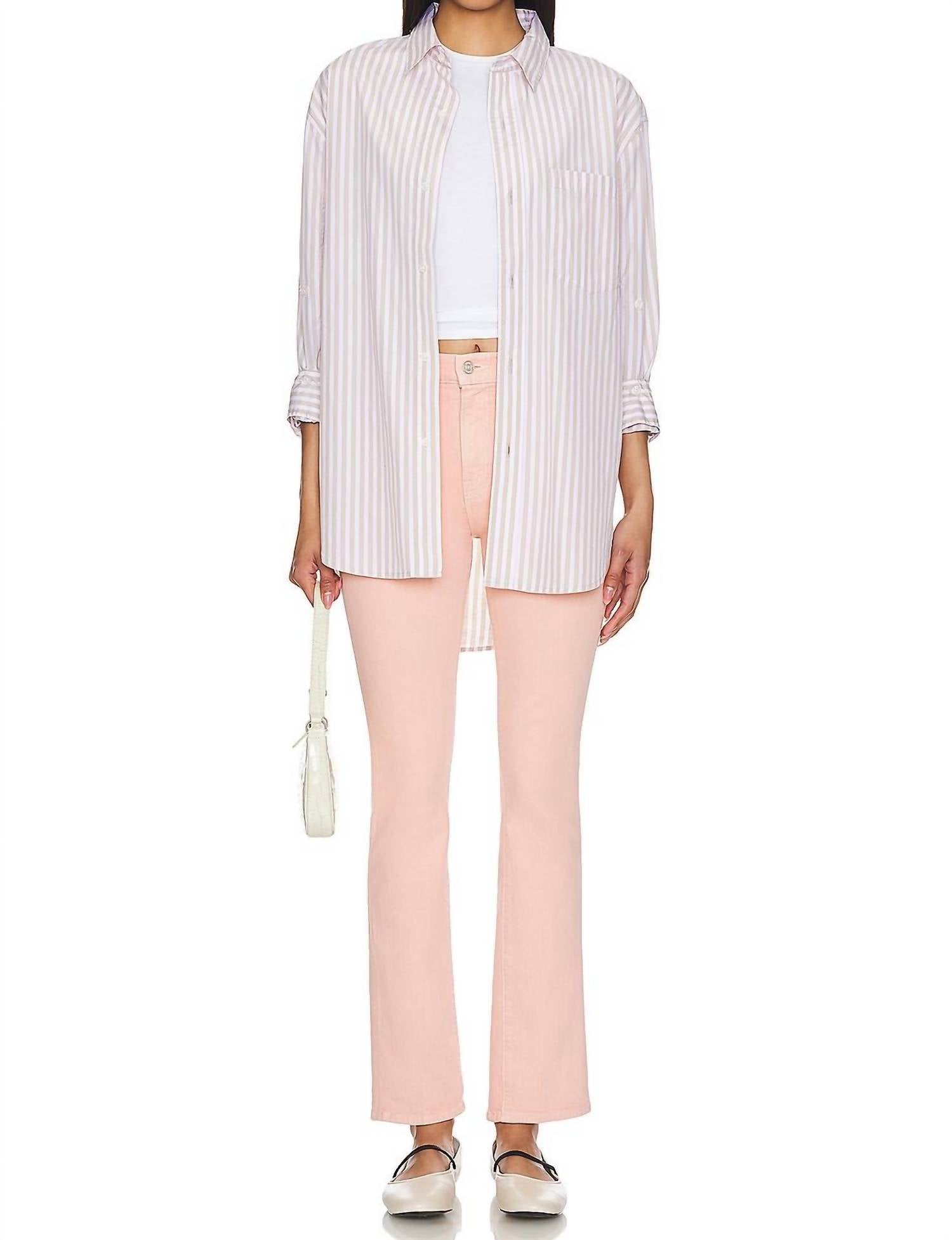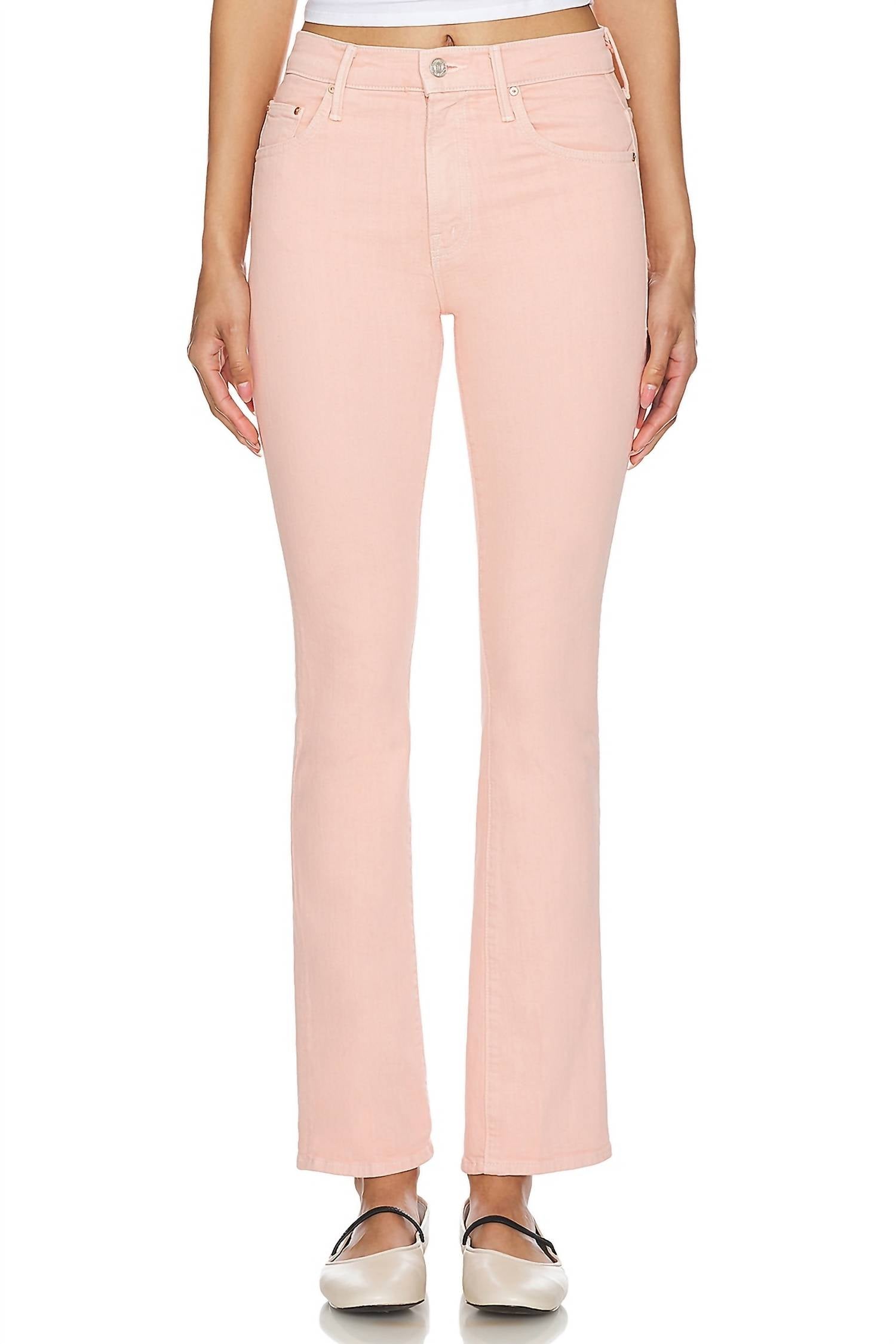 Elevate your denim collection with the Insider Hover Jeans by Mother in Peach Parfait, perfect for that relaxed yet chic 90s aesthetic. Featuring a slim fit through the thighs, this pair subtly flares below the knees, creating a flattering silhouette that complements its high-rise design. Crafted from a cotton blend of 98% cotton and 2% elastane, these jeans offer unparalleled comfort and a slight stretch. Equipped with a classic five-pocket style and a secure button closure, these pants are designed with the modern traveler in mind. Care: Machine wash. Size 24, with a waist width of approximately 13 inches, a rise of 10 inches, and an inseam of 30 inches.