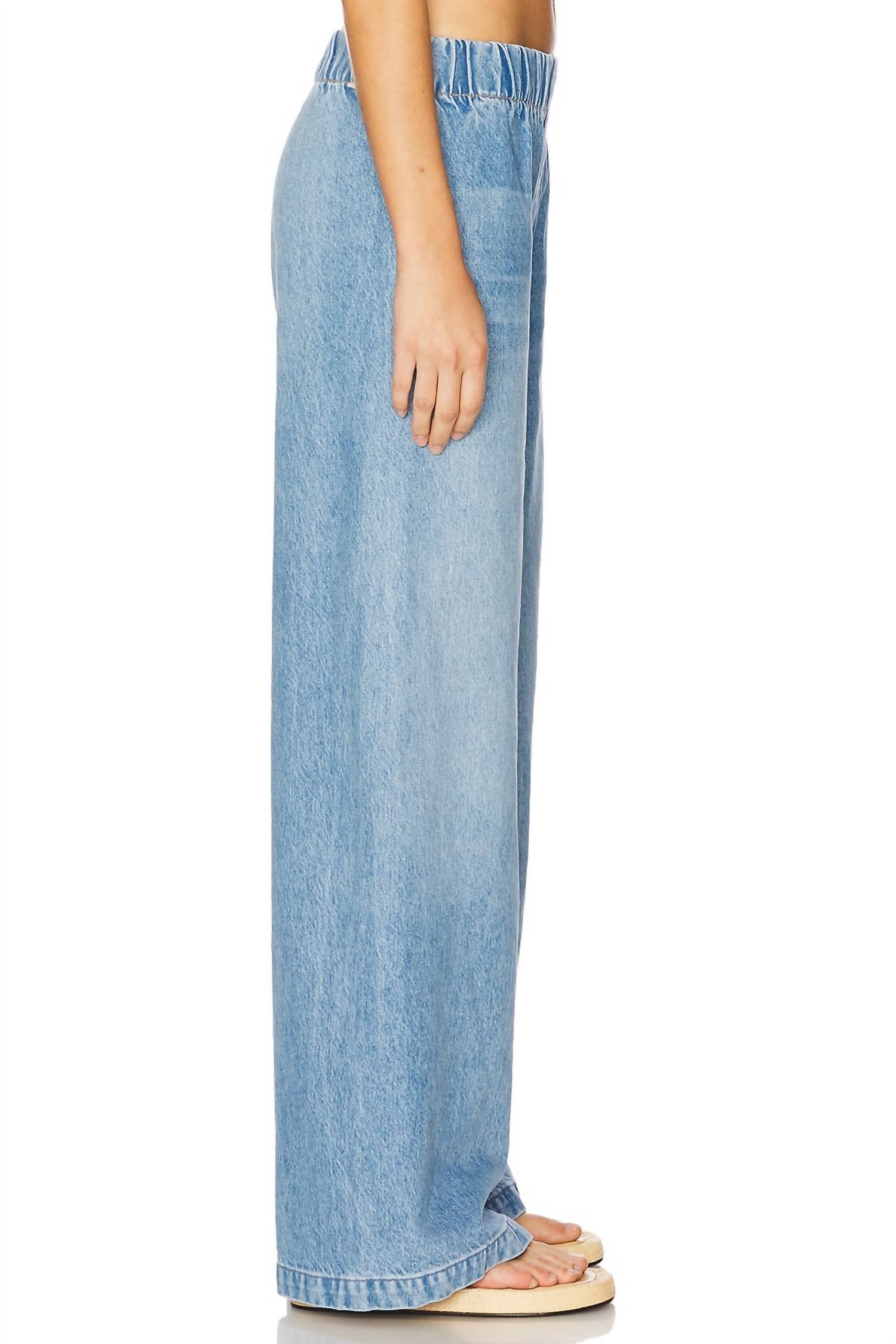 Pair these wide leg jeans with mules, slides or your favorite strappy sandals. These rigid denim pants are crafted from a sustainable blend of 41% recycled cotton, 41% lyocell, and 18% cotton. Designed with pull-on styling and an elastic waistband for comfort, they feature a relaxed fit with 61 cm measurements at both the knee and leg opening. Machine washable for easy care.