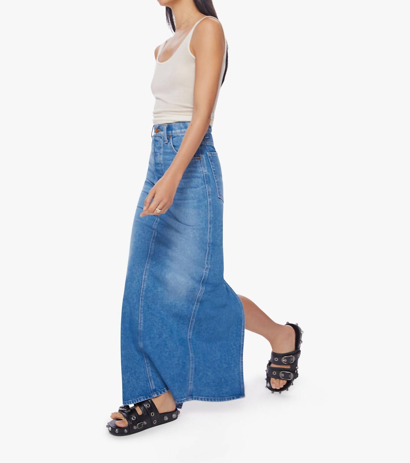 High-rise skirt is designed with a narrow fit and a thigh-high slit in the back. Made from a recycled cotton blend, Dine N' Dash is a mid-blue wash with a pretzel-detailed button and candy-inspired interior rivets. Rigid denim. Fabric: 41% Recycled Cotton 41% Lyocell 18% Cotton. Measurement: 41 3/4" Center Front Length. Model is 5'10" wears size 26. Made in Los Angeles.