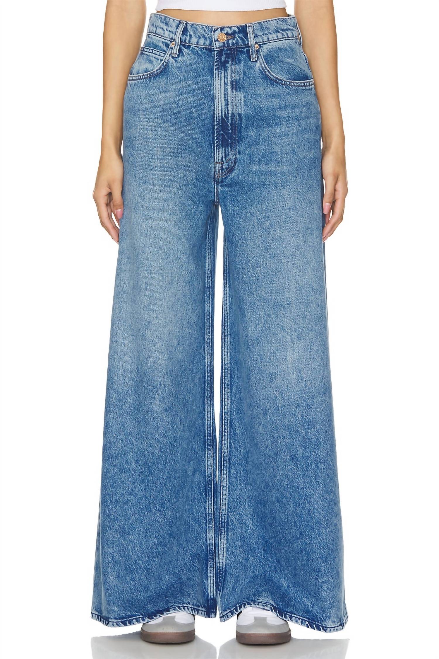 A flattering silhouette that's suprisingly versatile. Introducing the Sugar Cone Skimp Jean by Mother, a chic addition to your spring wardrobe. Crafted from a 59% Cotton/41% Lyocell blend, these wide-leg jeans offer a relaxed fit with a high-rise waist, perfect for a minimalist yet stylish look. Featuring a medium wash and solid pattern, these jeans are made in Los Angeles and designed with a convenient button closure and pockets. With an inseam of 30.25" and a rise of 13.5", they are ideal for holiday parties and can be machine washed and tumble dried with ease.