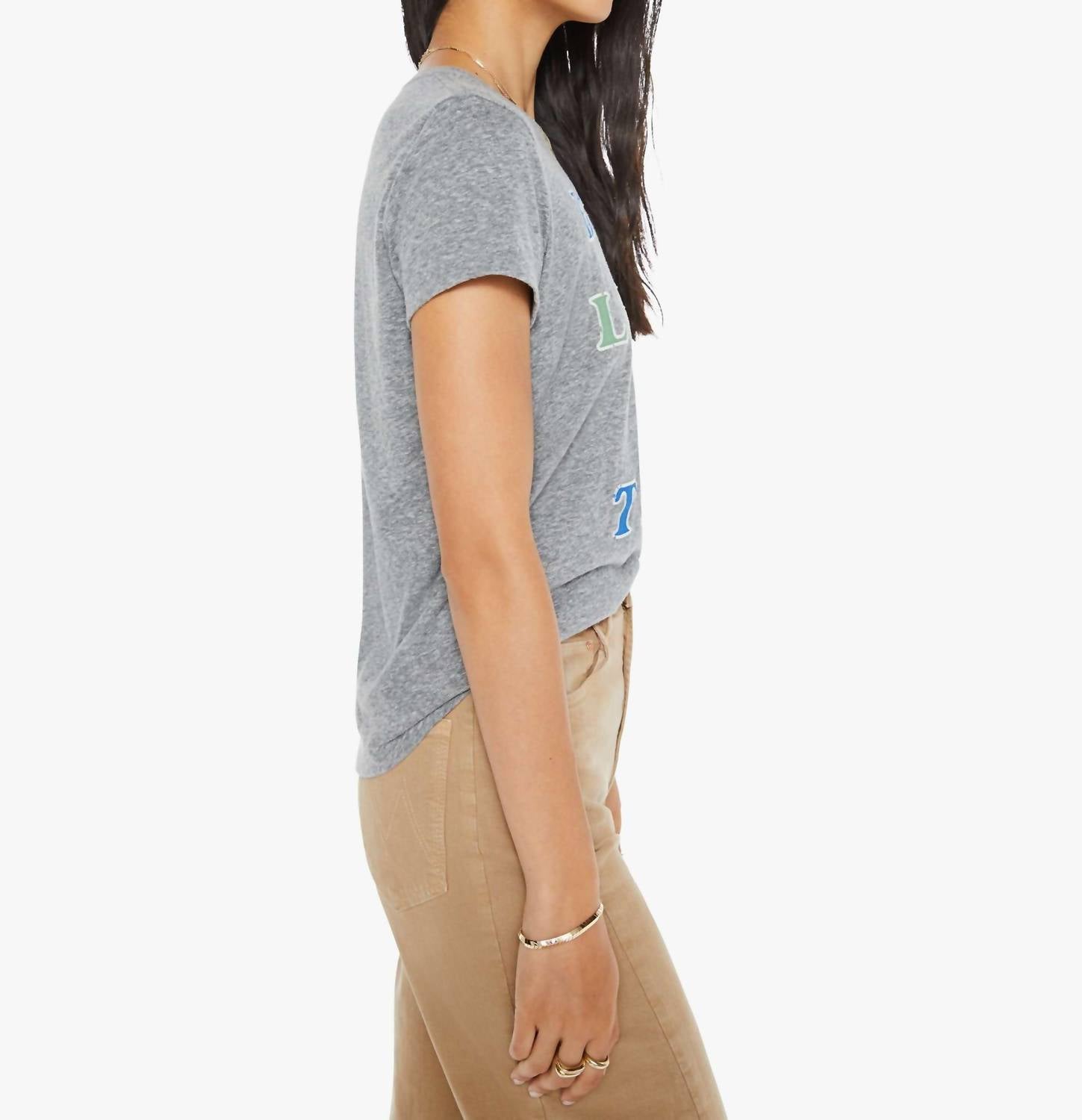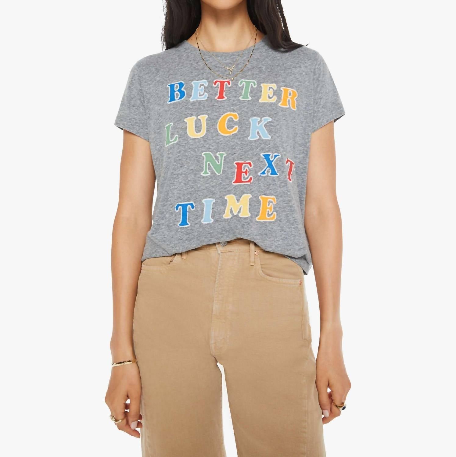 Look no further, you just found your perfect tee! Introducing The Boxy Goodie Goodie Tee by Mother, a perfect blend of comfort and style with its short sleeves and a soft crewneck for that vintage feel. This heathered grey tee, colored "Better Luck Next Time," features a vibrant graphic pattern with colorful appliqued letters. Made from 45% Polyester, 39% Cotton, 16% Viscose, it offers a slim fit through a convenient pull-on closure. With easy care in mind, this imported tee is machine washable and tumble dry safe.