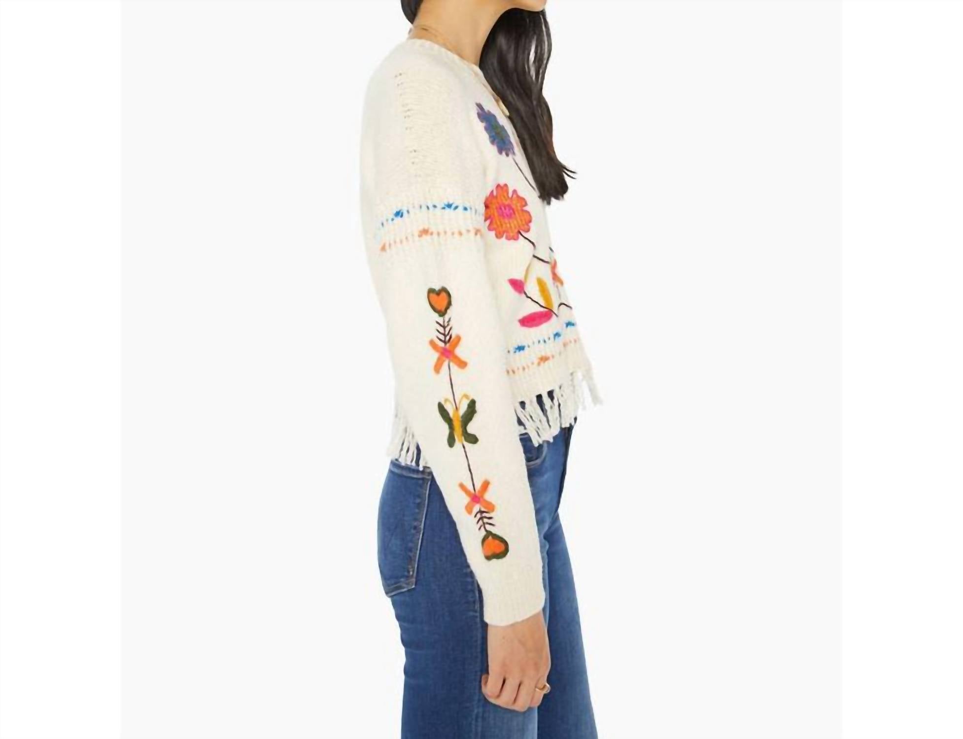 Experience the perfect blend of comfort and style with this trendy crew neck sweater, designed to effortlessly elevate your wardrobe. Pair it with your favorite denim and loafers for the perfect look. Introducing the Itsy Jumper Fringe Sweater by Mother, a standout piece in the charming "Little Trinket" off-white color featuring hand-embroidered flowers and motifs. This women's long-sleeve sweater is crafted from a blend of 93% cotton, 4% alpaca, and 3% acrylic, ensuring comfort and warmth. Made with a cropped crewneck and fringed hem, its drop shoulders offer a relaxed silhouette. Closure: Pull on. Origin: Imported. Model is 5'10" and wears a size small.