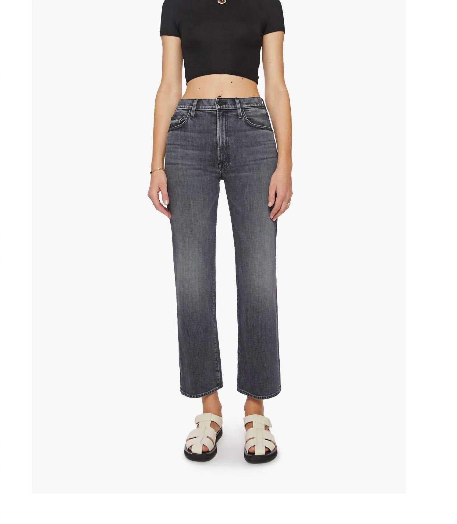 Fit to perfection, we love these high-waist jeans and you will too. High-waisted jeans with a wide straight leg, zip fly and clean 28 1/4-inch inseam. Crafted from semi-rigid SUPERIOR denim, Outta Sight is a dark grey hue with fading, whiskering and tonal hardware. These jeans are rigid and take time to break in. MOTHER says patience is a virtue.