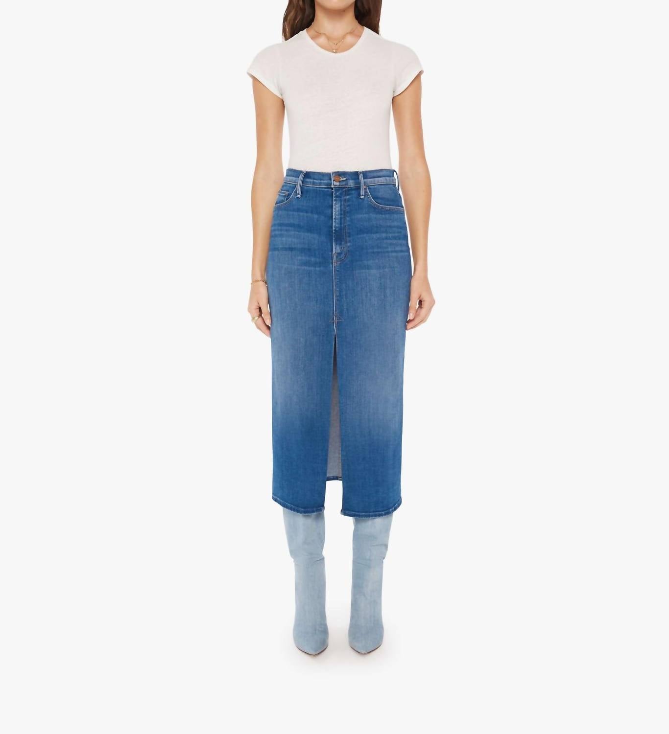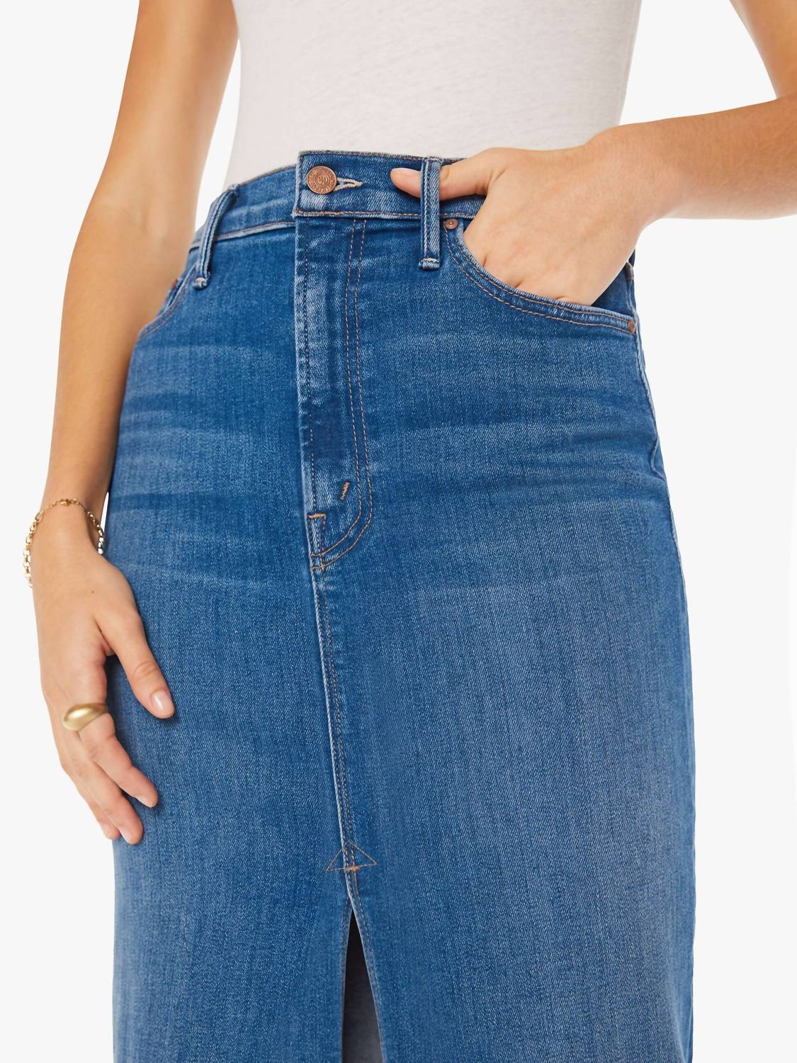 The midi length skirt is here to stay and we especially love this style. Introducing the Reverse Pencil Pusher Skirt by Mother in the striking "Hue Are You?" colorway, perfectly crafted for statement style. This cotton-blend skirt features a high rise with a narrow fit and an alluring thigh-high front slit, designed for both comfort and allure. It is meticulously made in the US using a blend of 81% Cotton, 11% Lyocell, 6% Polyester, and 2% Elastane. Closure: Zip closure. This versatile midi-length piece brings a touch of boldness to your wardrobe.