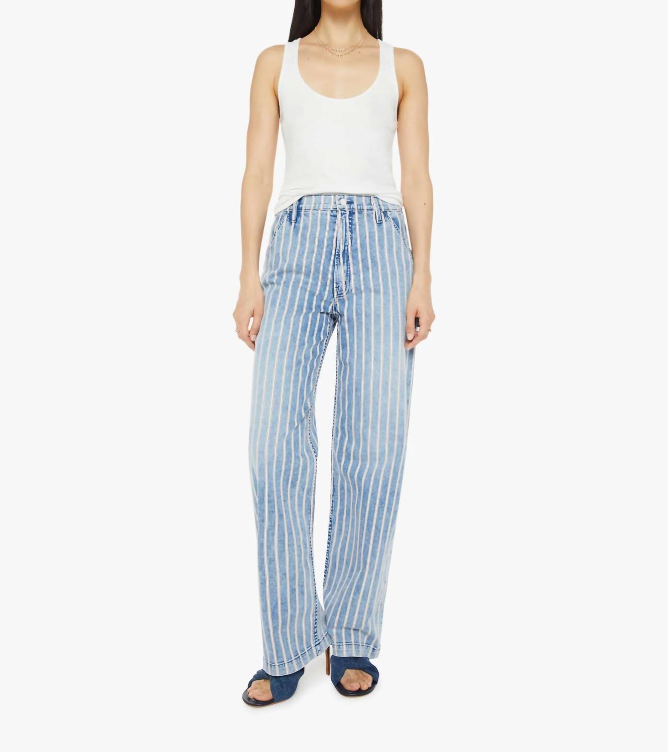 Discover the Mother Stud Finder Sneak Jean in the striking "I Like That For You" stripe pattern, perfect for the fashion-forward woman. These super high-waisted jeans feature a 12.5" rise, with a loose, straight leg design, complete with utility-inspired patch pockets and a practical hammer loop. Crafted in the USA from a soft stretch denim blend of 98% cotton and 2% elastane, they offer a 32" inseam and a 19" leg opening. Closure: Zip closure. Care: Machine wash, lay flat to dry.