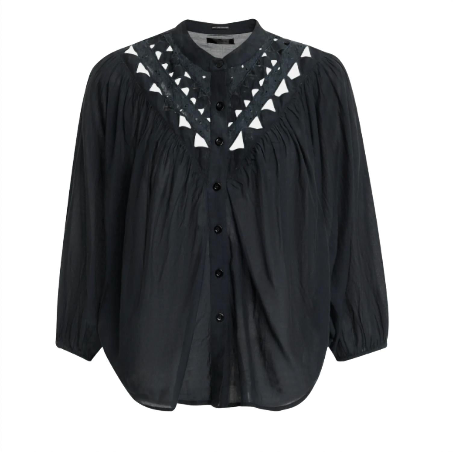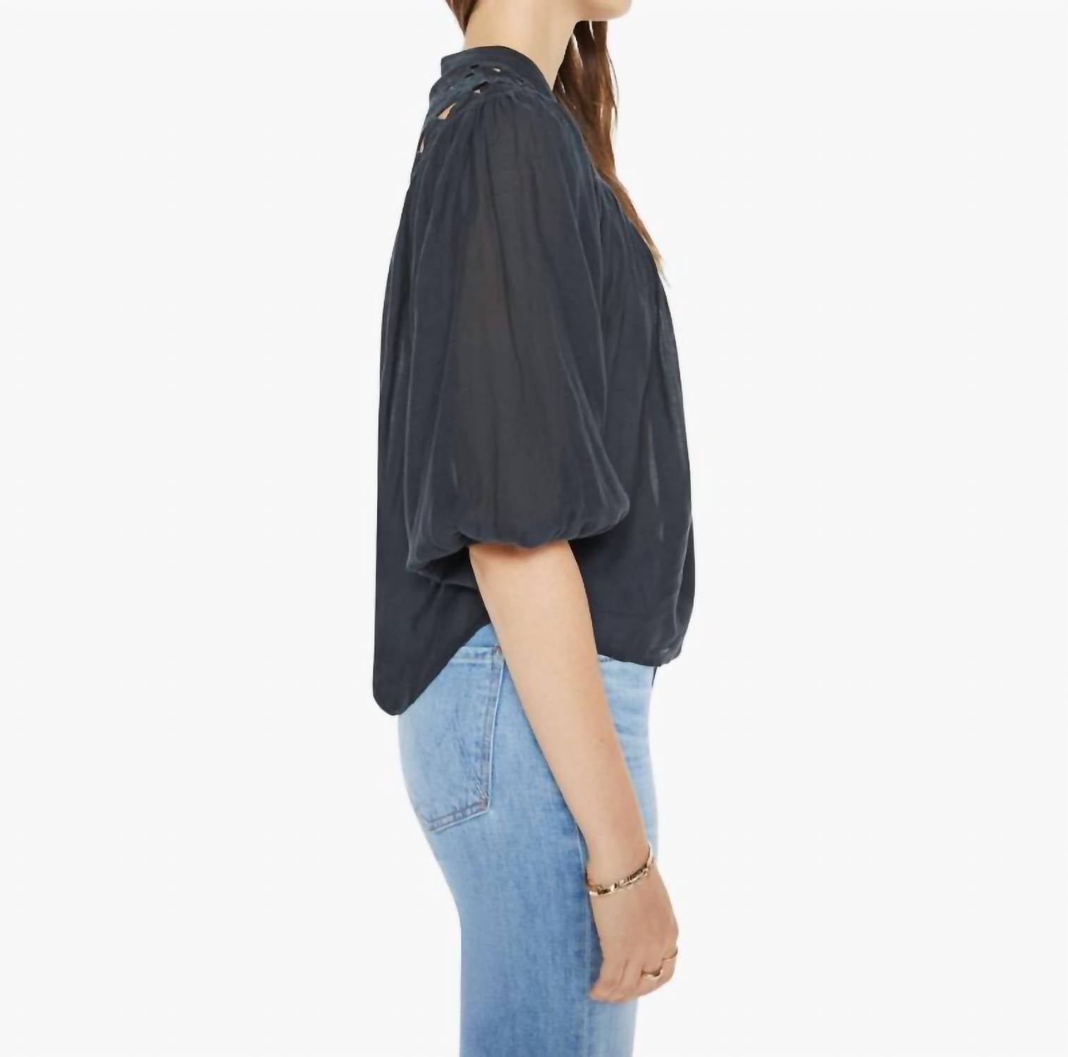 A timeless blouse that will never go out of style. Introducing the V-yoke Shirt by Mother, a chic addition to your wardrobe in the distinct Trifecta hue. This crewneck blouse features elbow-length balloon sleeves, buttons down the front, and stylish triangular cut-outs at the neckline. The shirt is crafted from a blend of 52% Cotton and 48% Viscose. Closure: Button closure. This imported piece offers a sophisticated silhouette with its curved hem.