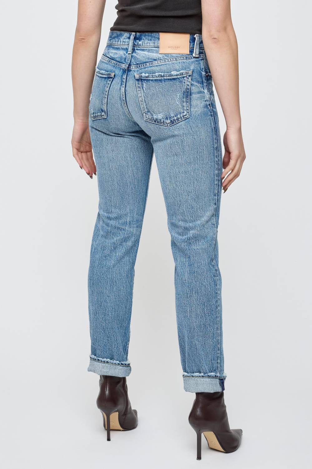 Introducing the Farmingdale Slim Straight Jeans by Moussy, crafted for a stylish and comfortable fit. Designed with a mid-rise waist and full-length silhouette, these jeans come in a light blue, solid pattern with a unique light wash perfect for spring's streetwear trends. These versatile jeans feature a button closure and a convenient zipper fly, with pockets for added utility. Effortlessly switch up your look by cuffing them, making them a must-have for concerts or casual outings.