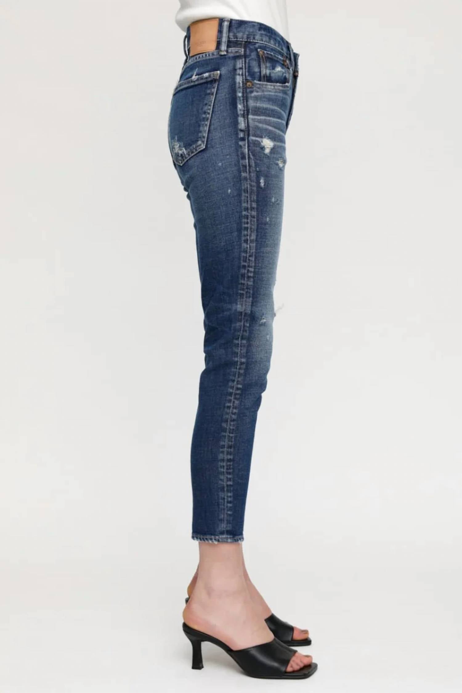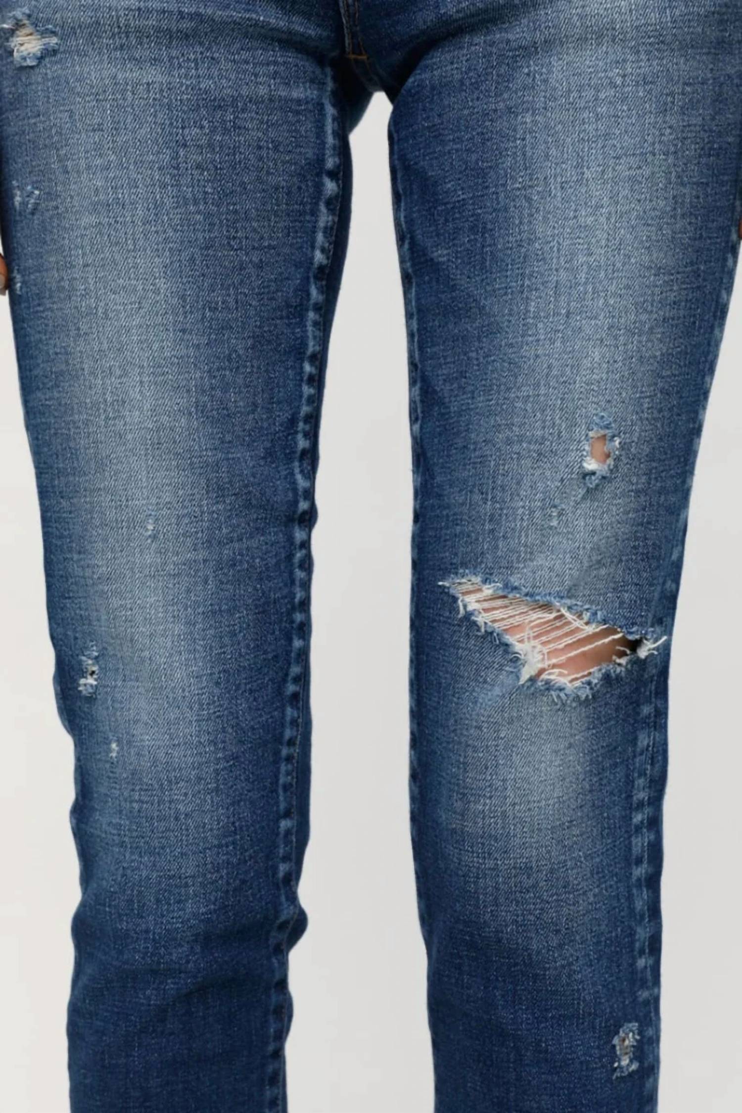 Pair these straight leg jeans with flats, sandals or even heels! You can't go wrong. Discover the Gleedsville Skinny Jeans by Moussy, a tribute to 90s fashion in a classic dark wash blue. Crafted from 98% Cotton and 2% Spandex, these denim straight leg jeans are made in Japan. They feature a zip fly with button closure, five-pocket styling, and eye-catching distressing over the knee. Care for them is easy with machine wash instructions, and they are designed with a 26" inseam, 11" rise, 14" knee opening, and 10" leg opening.