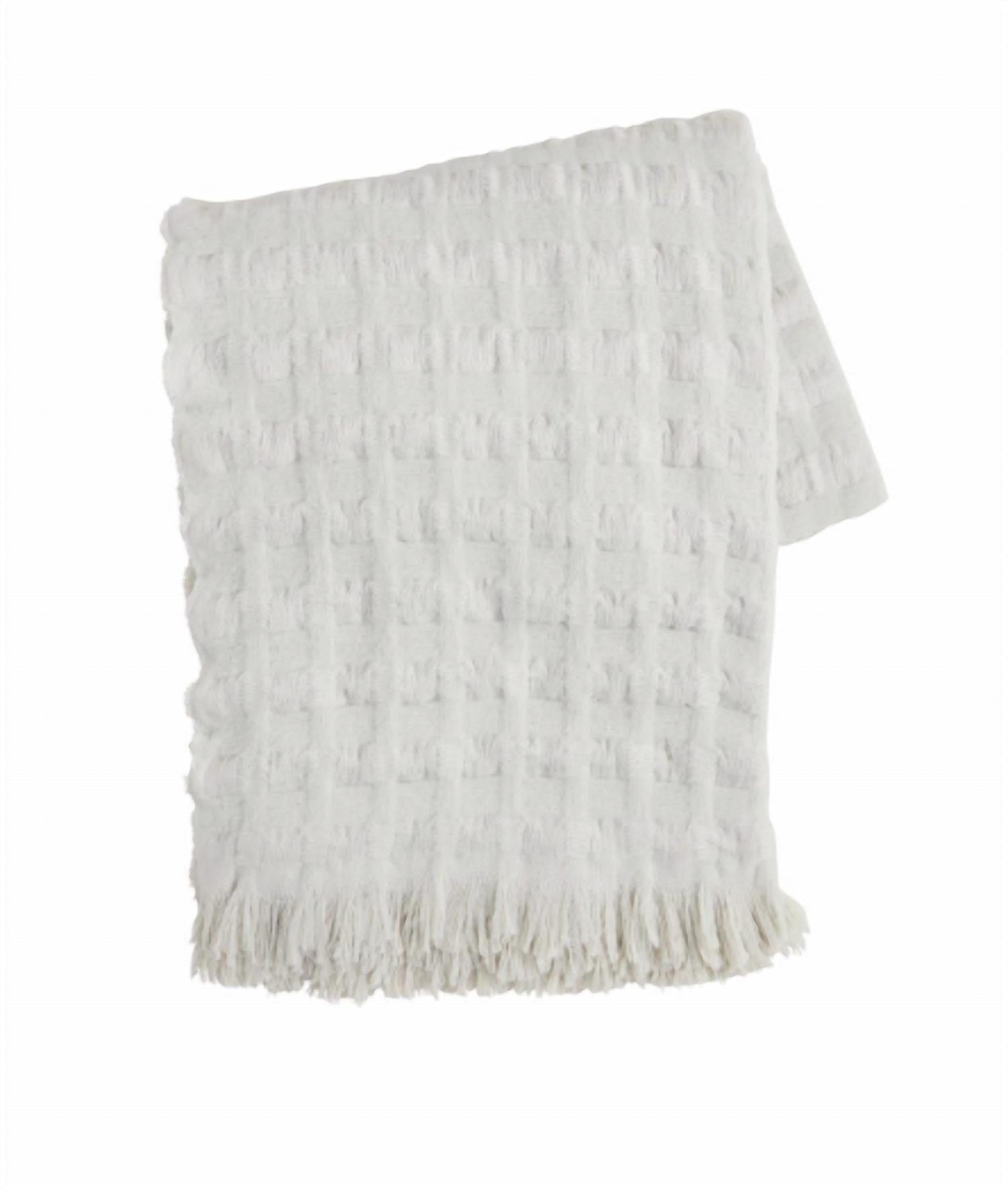 The Mud Pie Woven Waffle Throw Blanket in gray is a stylish addition to any living space. With a textured waffle weave and charming corner tassels, this throw blanket measures 50 inches by 60 inches. Made from 100% cotton, it offers both comfort and durability. Care is simple with machine wash cold, and it can be tumble dried on low or ironed on medium if needed.