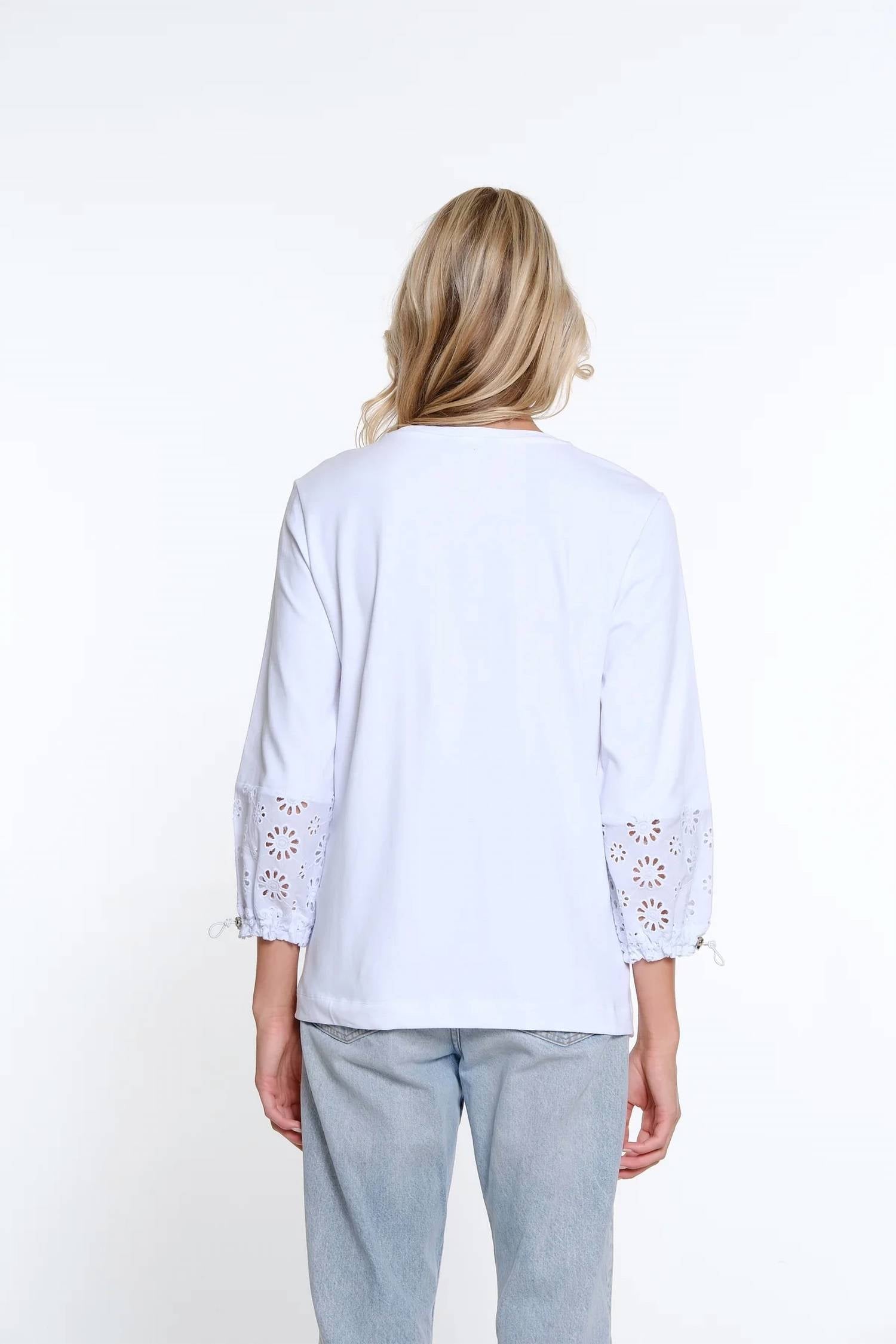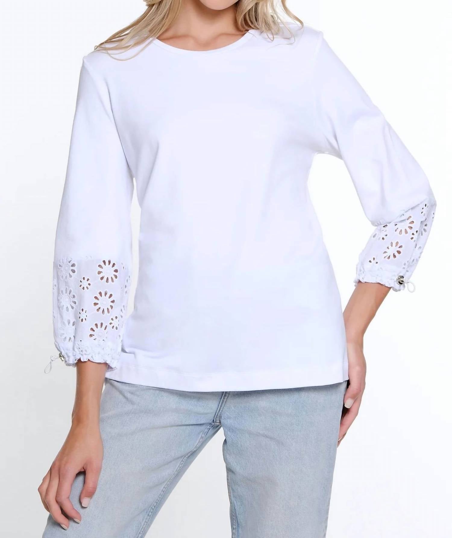 Pair this with your favorite jeans and slides for your next girls night out. Introducing the Drawstring Eyelet Sleeve Top by Multiples, a chic and comfortable addition to your wardrobe in classic white. Featuring woven eyelet three-quarter sleeves, it adds a feminine, textured touch to any ensemble. Crafted from a soft and stretchy cotton-spandex blend, it offers all-day comfort with a versatile crew neckline and an adjustable drawstring for a customizable fit. Closure: Pull on.