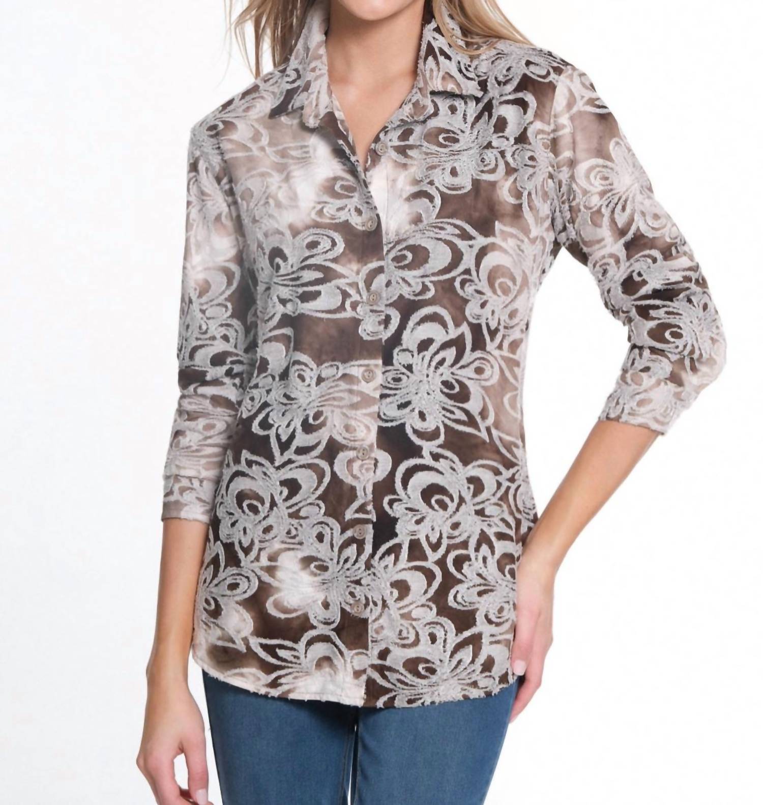 Stylish button-down shirt featuring roll-tab three-quarter sleeves and a classic collar. Hi-lo cut adds a flattering silhouette. Floral pattern in brown enhances its versatile charm. Comes with a button closure for easy wear. Designed for both style and comfort.