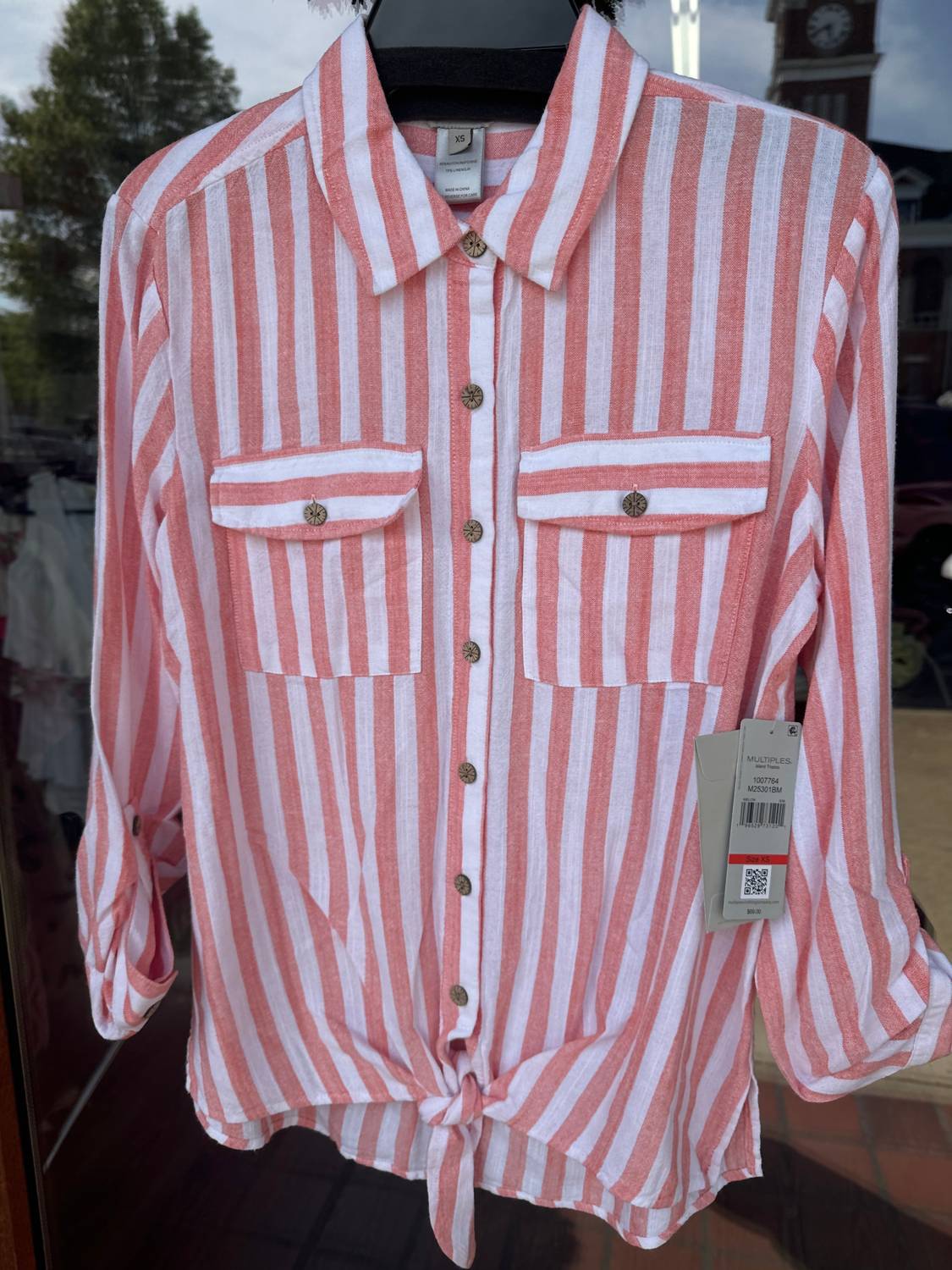 Great fit, cute design, soft fabric. You'll love everything about this long sleeve tee. The Melon Stripe Button Shirt by Multiples is a chic addition to your wardrobe, perfect for spring occasions like birthdays or Mother's Day. Crafted from a blend of 85% Rayon and 15% Linen, this long sleeve shirt features a classic collar and a stylish stripe pattern in pink. Its button closure and convenient pockets make it both practical and preppy. Care for this garment by machine washing cold and line drying to maintain its quality.