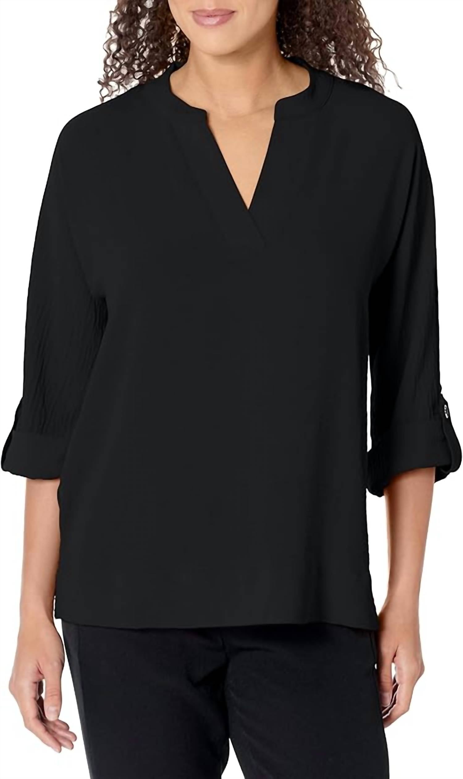 A timeless blouse that will never go out of style. Vneck Blouse with rolled tab sleeve. Great Drape, Lightweight.
