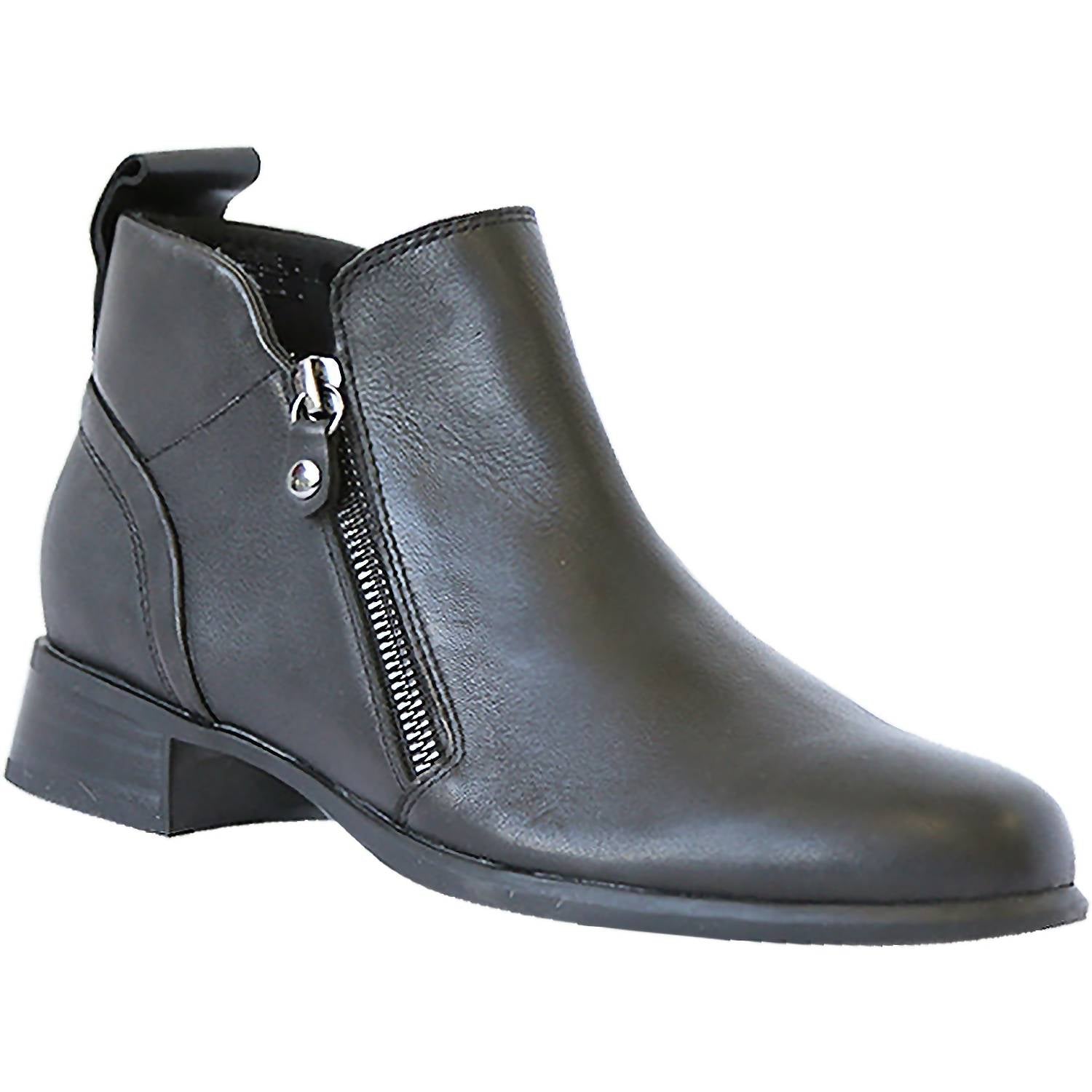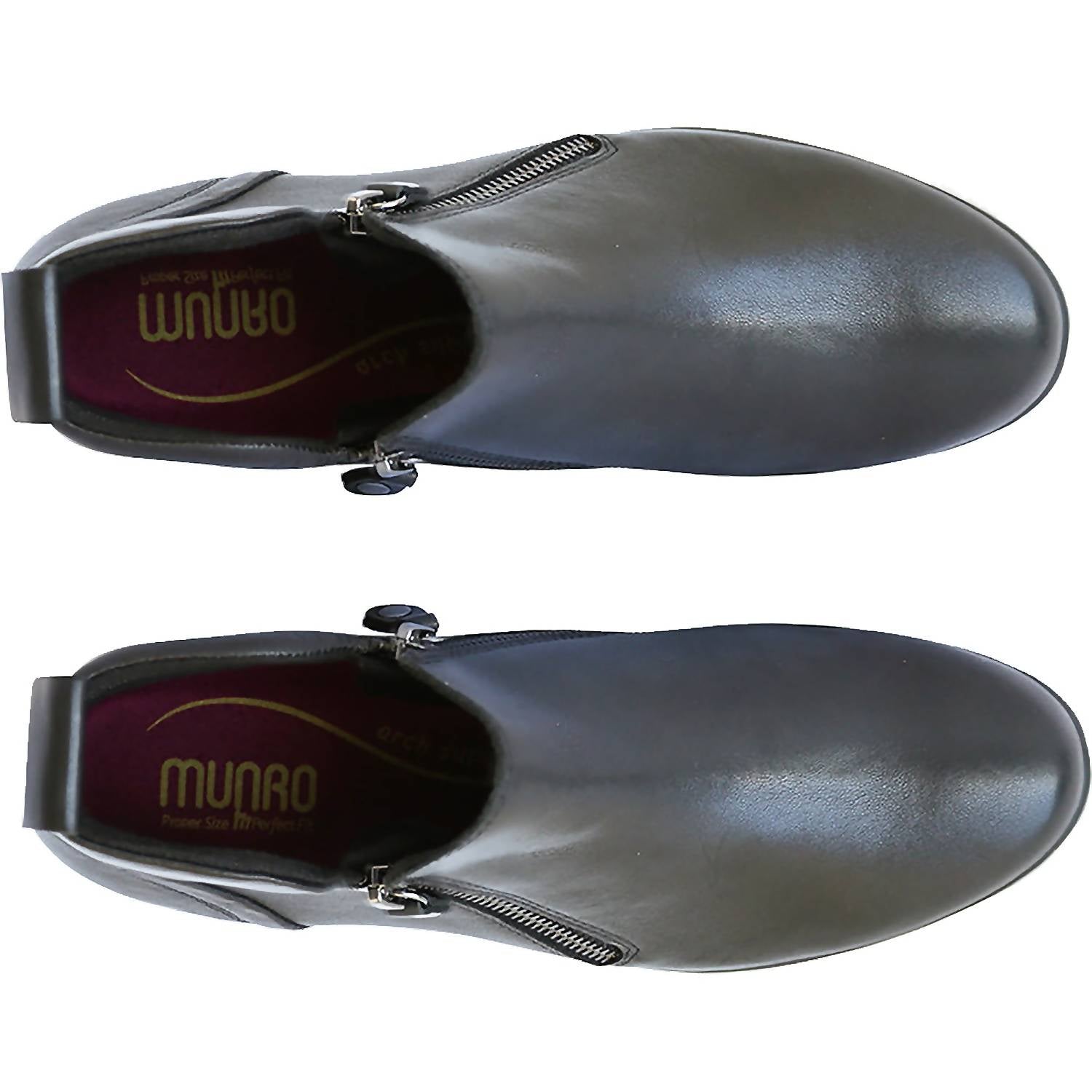 Say hello to the perfect, most versatile boot. The ankle height makes this style easily transition from day to night. Wear them with your favorite skinny jeans and tee for a more laid back look, or pair them with your favorite mini dress and jacket for a night out on the town. Experience both style and comfort with the Munro Neko Women's Leather Ankle Boots in classic black. Crafted from high-quality leather and assembled in the USA, these boots feature dual gunmetal zippers for hassle-free wear. The removable contoured footbed and molded insole promise exceptional support and stability, complemented by a shock absorbent and flexible design. With a chic stacked Leawood heel measuring 1", and a latex rubber outsole, they offer both a sturdy build and a sleek appearance, perfect for any occasion from everyday wear to special gatherings.