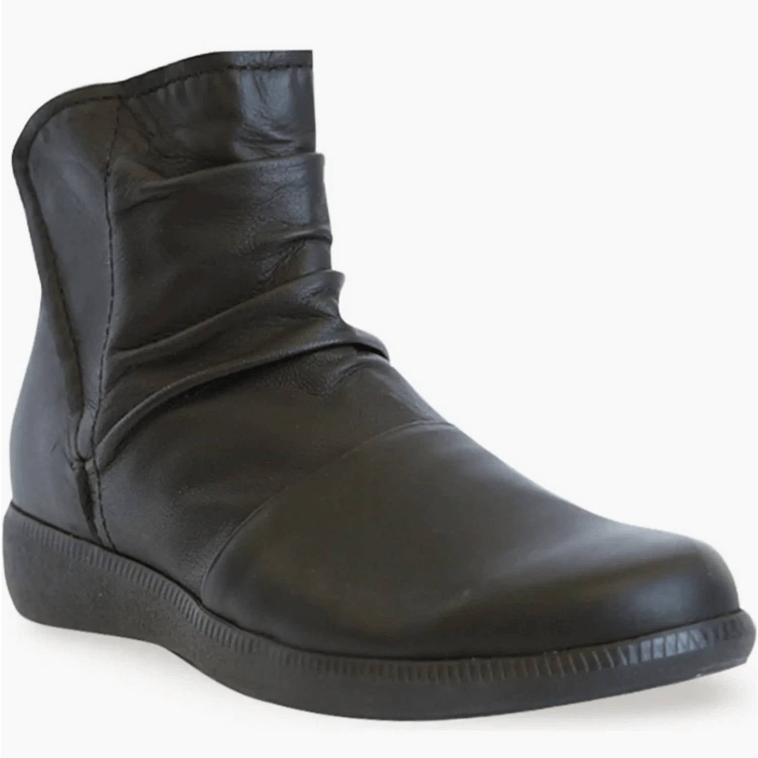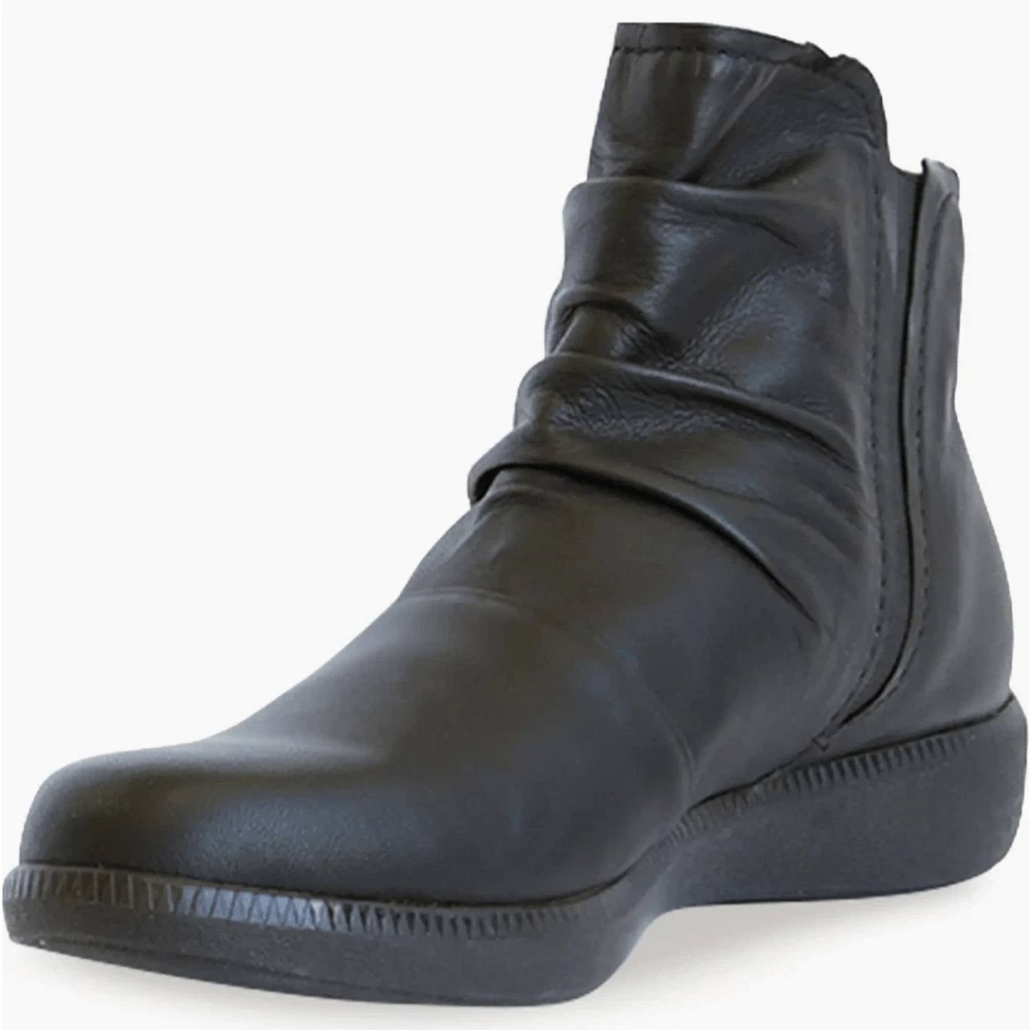 Say hello to the perfect, most versatile boot. The ankle height makes this style easily transition from day to night. Wear them with your favorite skinny jeans and tee for a more laid back look, or pair them with your favorite mini dress and jacket for a night out on the town. Introducing the Women's Scout Ankle Bootie by Munro, a perfect blend of style and functionality for your workwear ensemble. These black leather booties feature a flat heel with a heel height of 1" or under, ensuring all-day comfort. Skillfully crafted with a leather upper and synthetic lining, paired with a durable rubber sole. Assembled in the USA of imported materials, these booties offer a chic round toe design tailored for the modern woman.