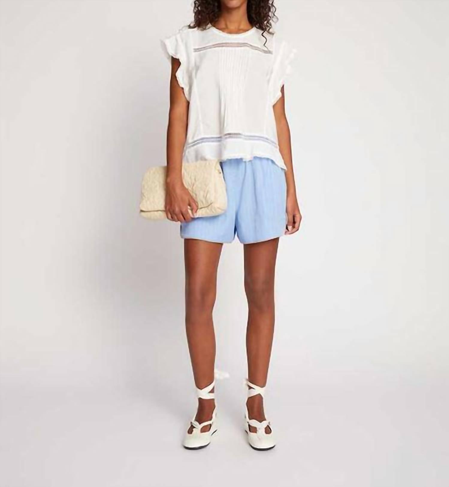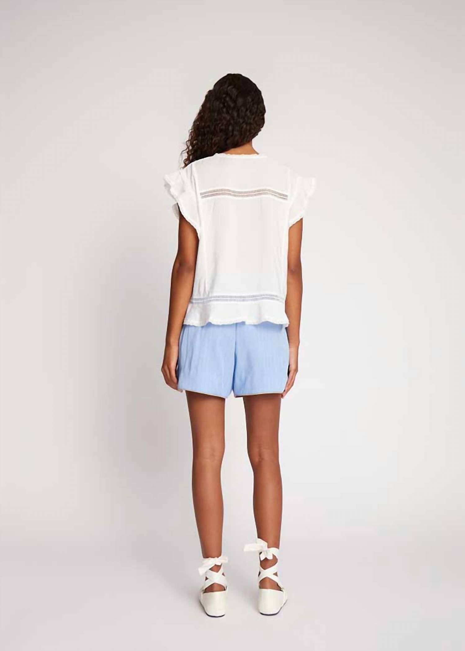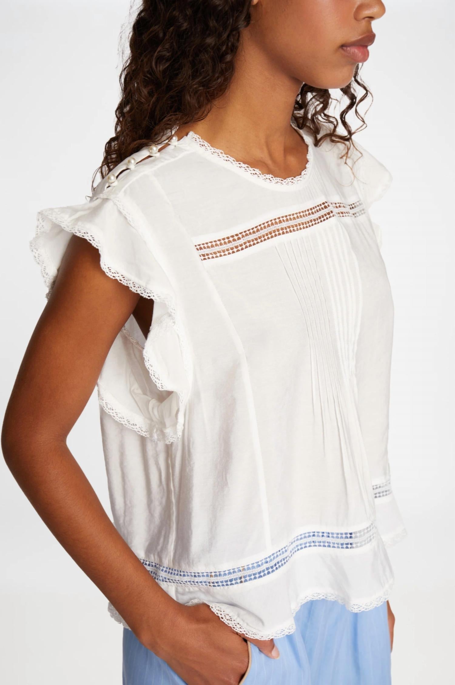 A timeless blouse that will never go out of style. Discover the Usalina Top by MUNTHE, a boho chic piece perfect for your summer wardrobe. This white textured blouse features cap sleeves with beautiful embroidery anglaise details and a crewneck design. Crafted from 82% Lenzing and 18% Polyamide, it offers a regular fit with a fine pearl closure on the shoulder. Care instructions recommend hand washing to maintain its elegance, making it an ideal choice for vacation or Easter occasions.