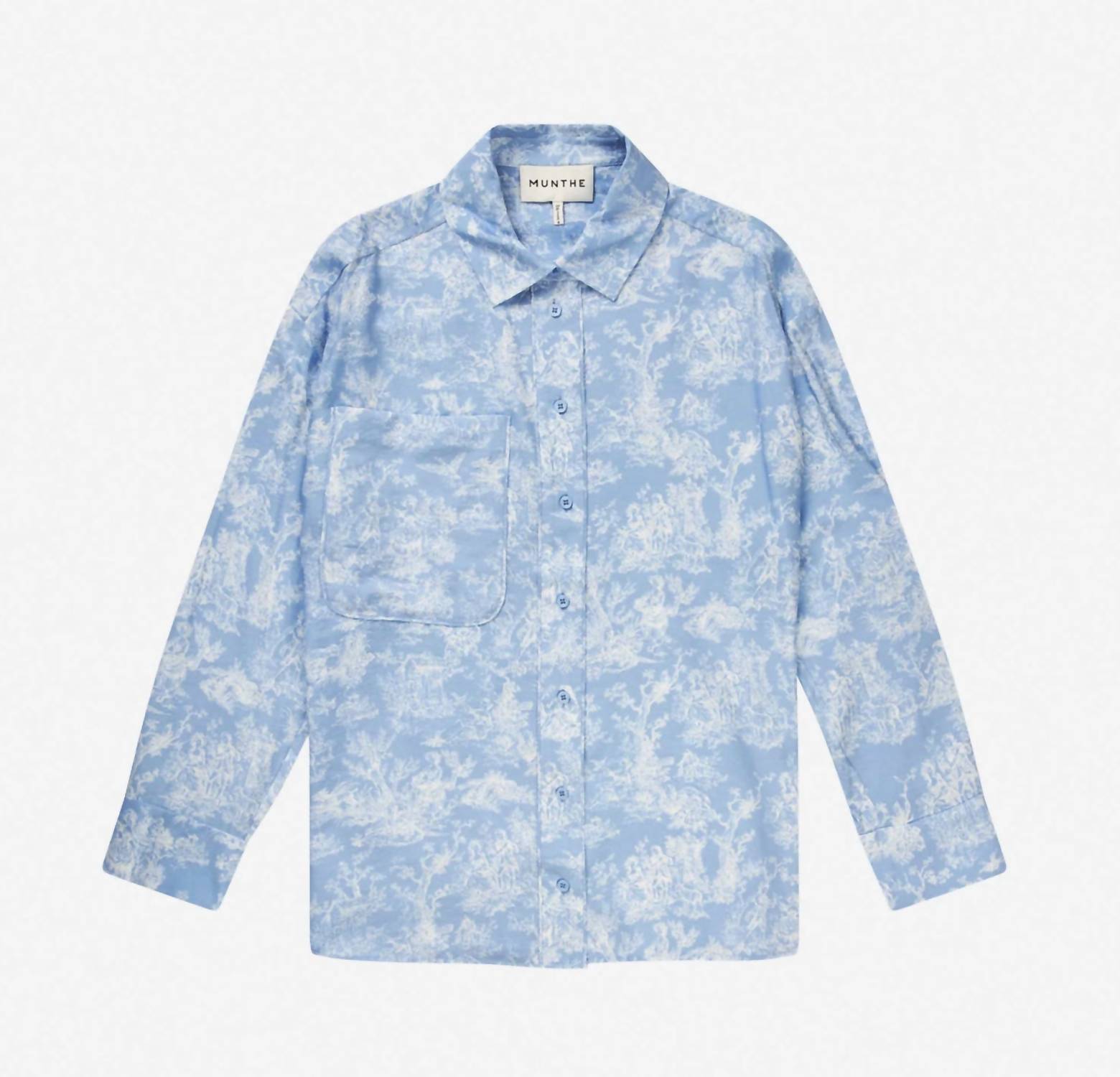 Pair this with your favorite jeans and slides for your next girls night out. Discover the Women's Filius Button Shirt by MUNTHE, a chic blouse perfect for your summer vacation wardrobe. This blue floral patterned piece features long sleeves and a classic collar for a sophisticated streetwear look. Designed without pockets for a streamlined silhouette, it offers a secure button closure. While specific wash and dry instructions aren't provided, care should be taken to preserve its quality.