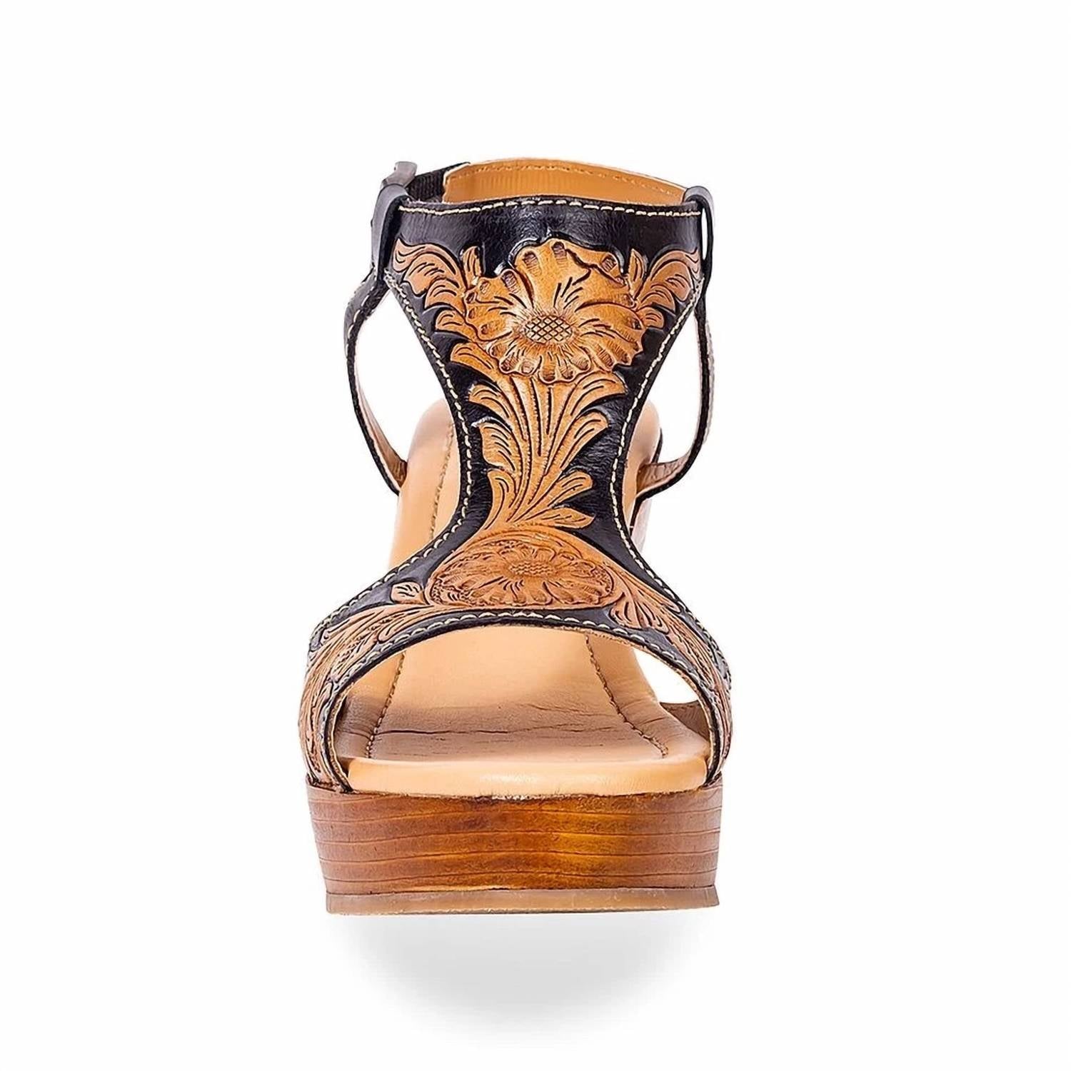 Step into style with the Talitha Hand Tooled Wedge Sandal by Myra, designed for the modern woman who appreciates comfort combined with vintage flair. These brown and black leather wedges feature a convenient buckle ankle closure and a cushioned footbed, ensuring all-day comfort at your spring dinner parties. The open toe design and high 3-inch wedge heel add an elegant touch to any outfit. Sizing is true to size, and if you're between sizes, Myra recommends sizing down for the perfect fit.