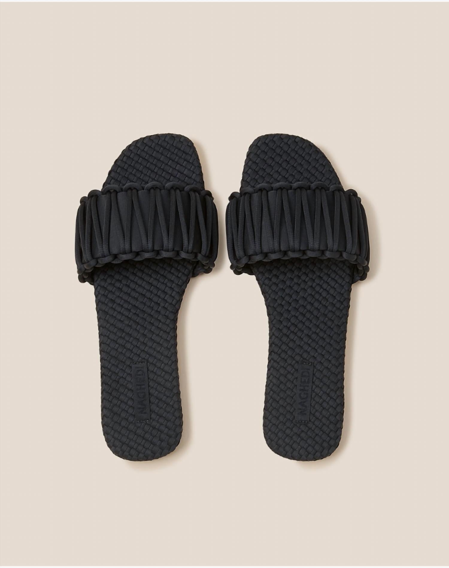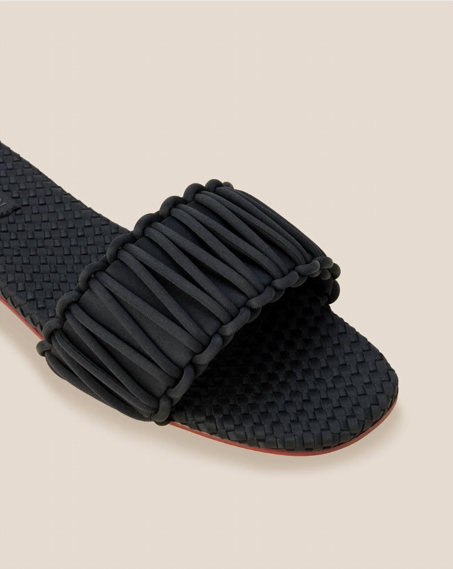 Flowy dresses, cropped pants, and even jumpsuits... this sandal works with them all! Experience the epitome of minimalist elegance with NAGHEDI's Women's Athens Slide in Onyx. Crafted with a hand-stitched neoprene upper backed by luxurious natural tanned leather, these sandals effortlessly combine comfort and style. The open toe design features a handwoven neoprene footbed and a natural buffed leather sole, offering both structure and a polished finish. Ideal for summer, vacations, or Mother's Day, the flat heel ensures true-to-size comfort for an effortlessly chic look.
