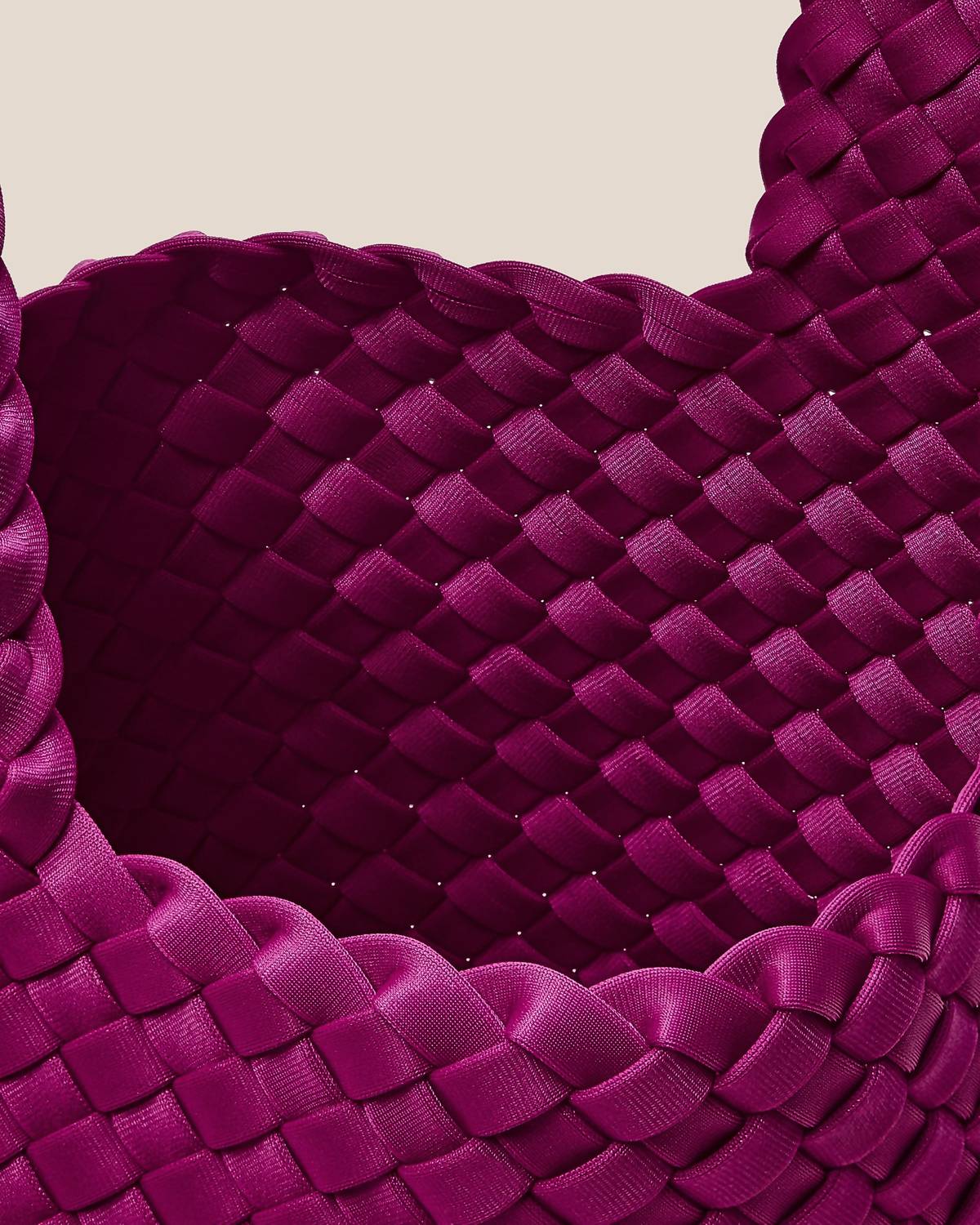 Lipstick, check. Mints, check. Credit card, check. The cutest little bag that holds all of your necessities. Introducing the Naghedi Kyoto Clutch Bag in vibrant Rio, designed to elevate your evening ensembles with its playful silhouette. Crafted from handwoven neoprene, this clutch offers a distinctive texture and delightful pop of fuchsia. It features a secure slide-through loop closure, making it both stylish and functional. Dimensions: 9" height, 6" width, 5" depth, with a 2" handle drop.