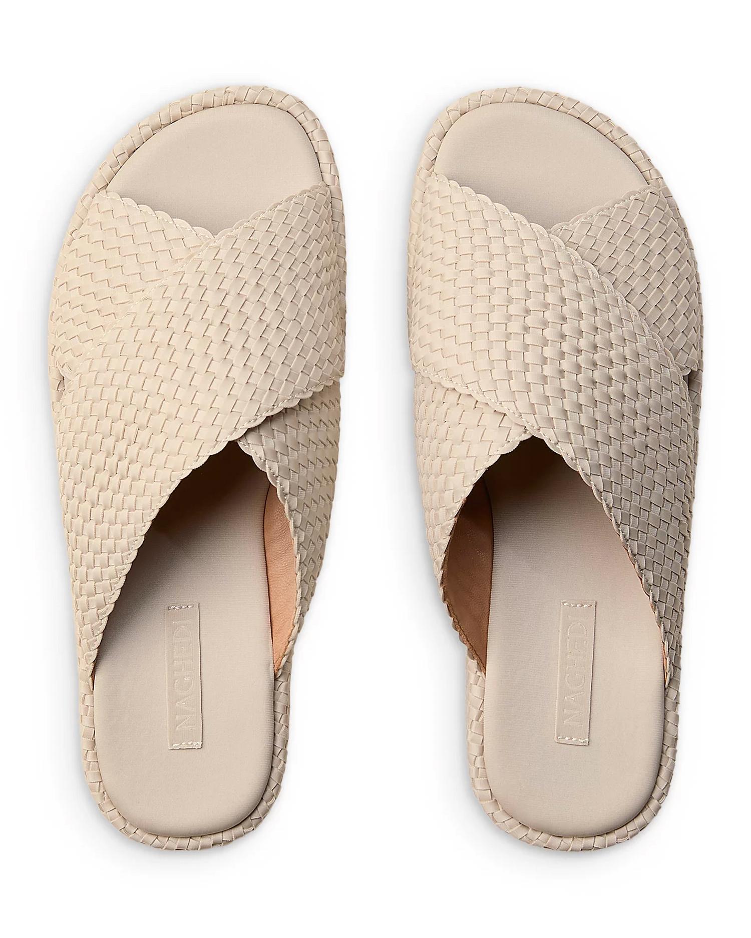 Classicly cute and all-day-wearable. We love this sandal. The Women's Laguna Platform by NAGHEDI in Ecru is the ideal minimalist sandal for your summer wardrobe. This slip-on slide features a neoprene and leather upper with artisanal woven detailing and a comfortable neoprene lining, perfect for vacation or gifting for Mother's Day. It is designed with a round, peep toe and a 1.37" rubber platform heel for that subtle lift in every step. Note: It runs large, so consider ordering a half size down for the best fit.