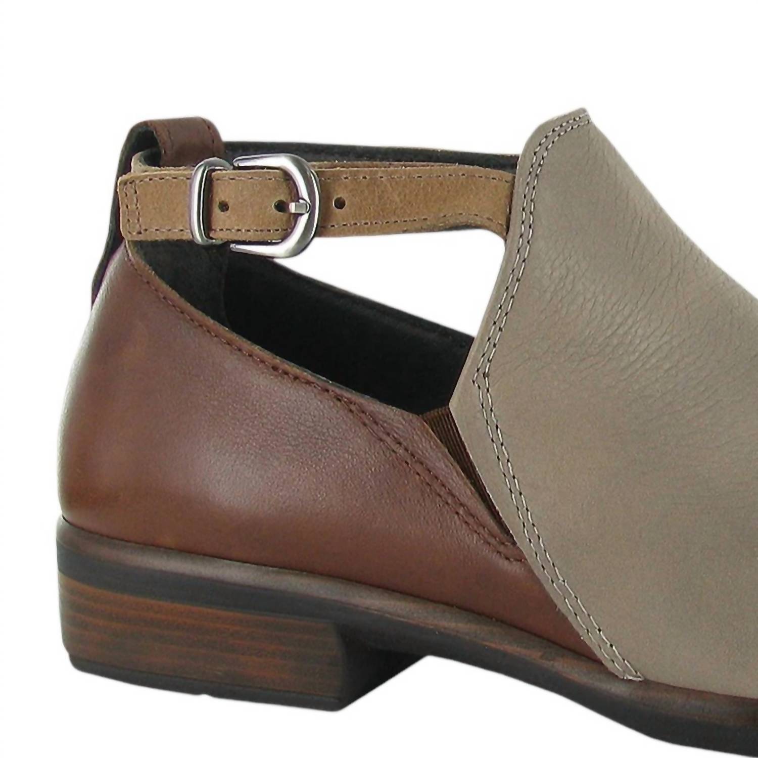 This bootie features an upper strap and a removable, anatomic cork footbed wrapped in microfiber and leather. It has a 1.5" polyurethane sole, a 3" shaft height, and a 9.5" shaft circumference. The heel height is 1.5".