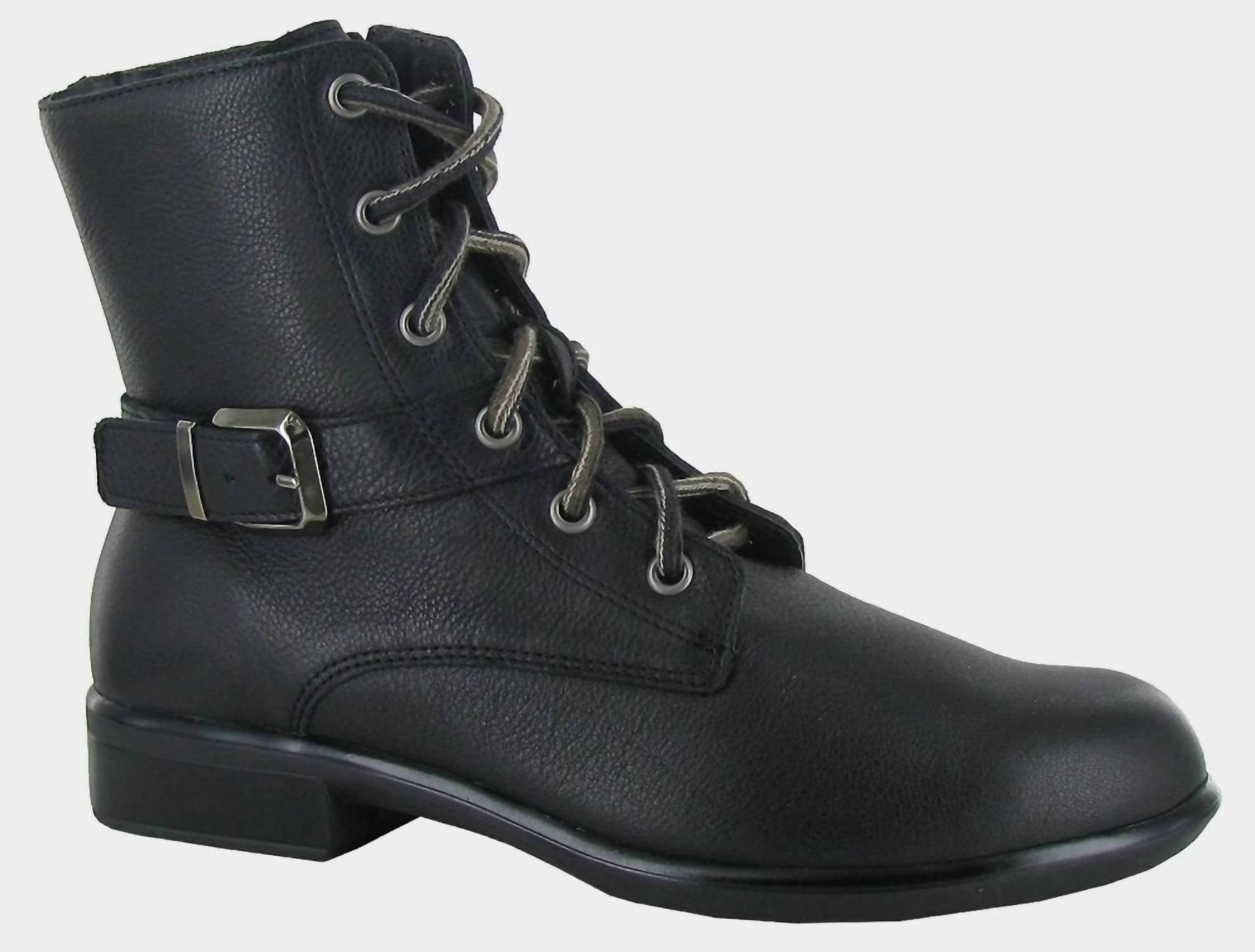Upgrade your shoe game with these stylish lace-up boots, designed to merge sophistication and comfort. You'll be reaching for these shoes season after season. Enhance your fall wardrobe with the Women's Soft Leather Boot by NAOT in classic black. Featuring a sleek design, this boot offers a comfortable medium width and a low 1.5" heel ideal for minimalist style. The round-toe boot incorporates a durable polyurethane sole and slip-resistant properties for secure steps. The orthotic-friendly design includes a removable anatomic cork and latex footbed that molds to your foot, ensuring customizable comfort. Perfect for a vacation or everyday wear, this piece combines practicality with elegance.